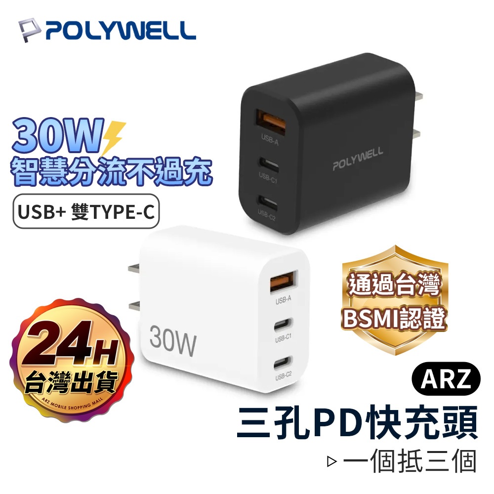 PD快充 30W三孔充電頭【ARZ】【E260】Polywell Type C USB 充電器 快充頭 快充插頭 豆腐頭