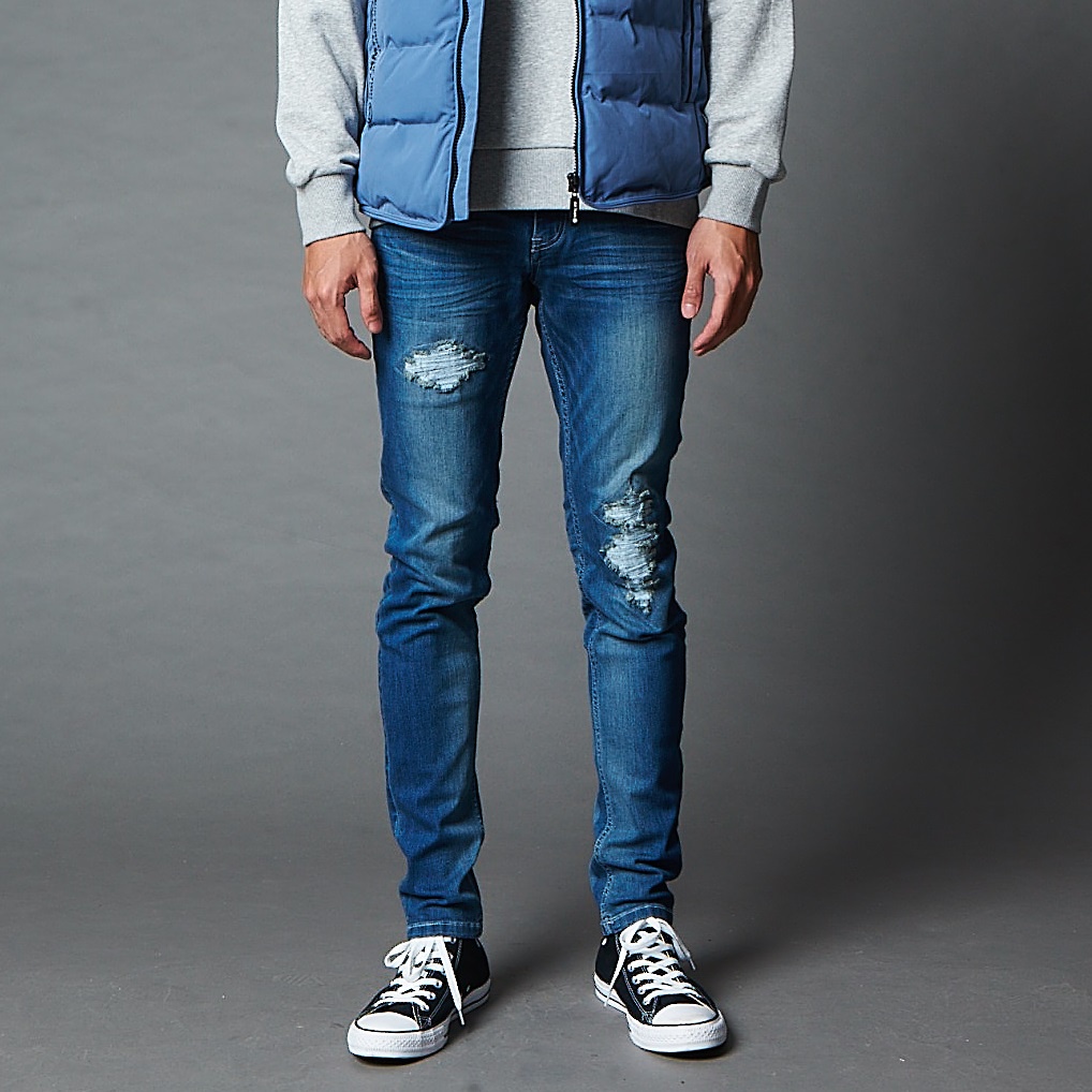 BIG TRAIN 吸排剪接割破補丁小直筒 中藍-BM7292