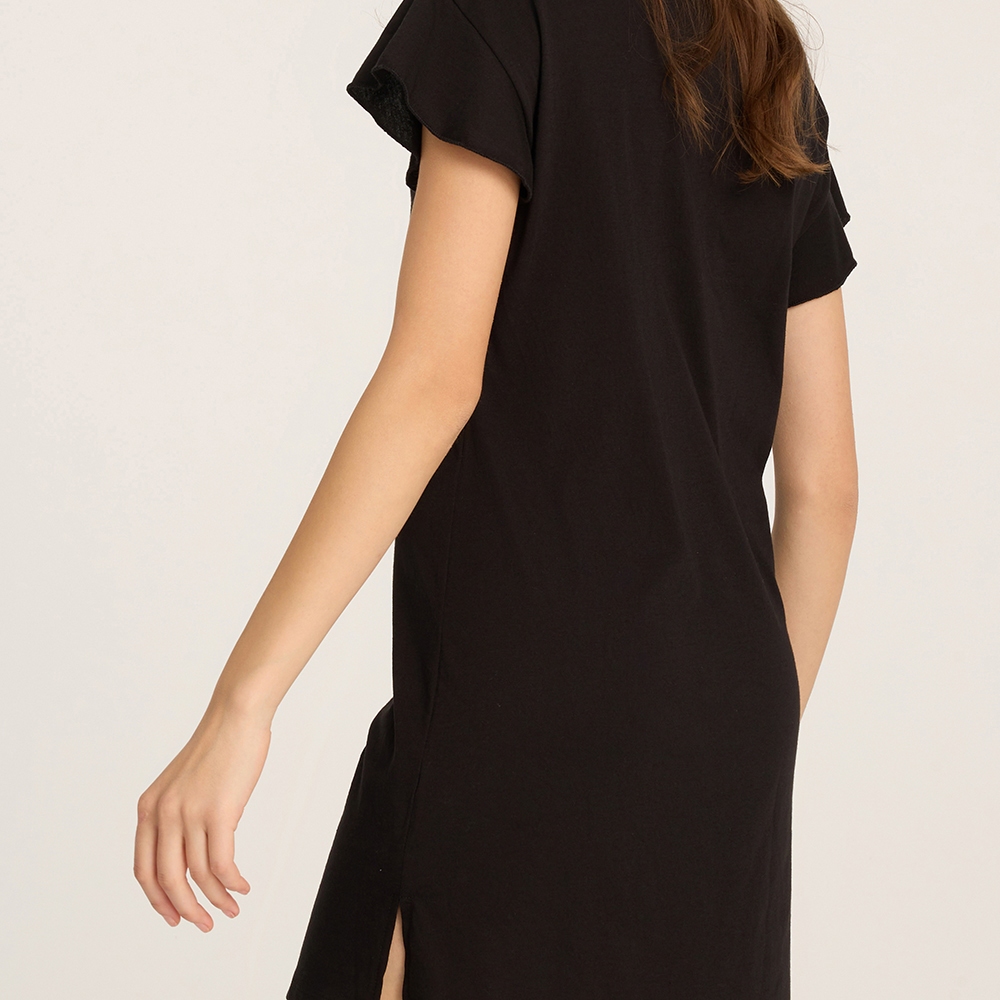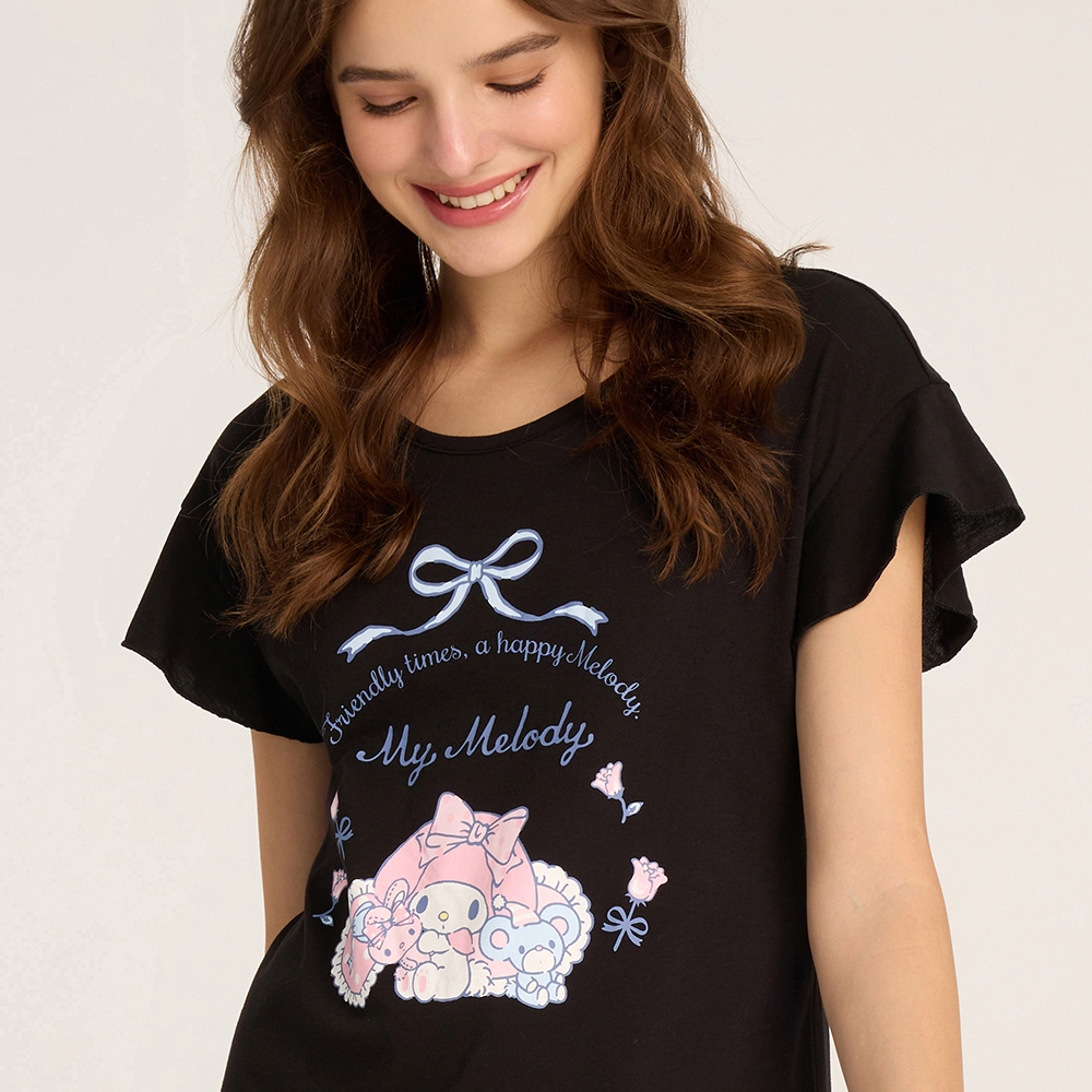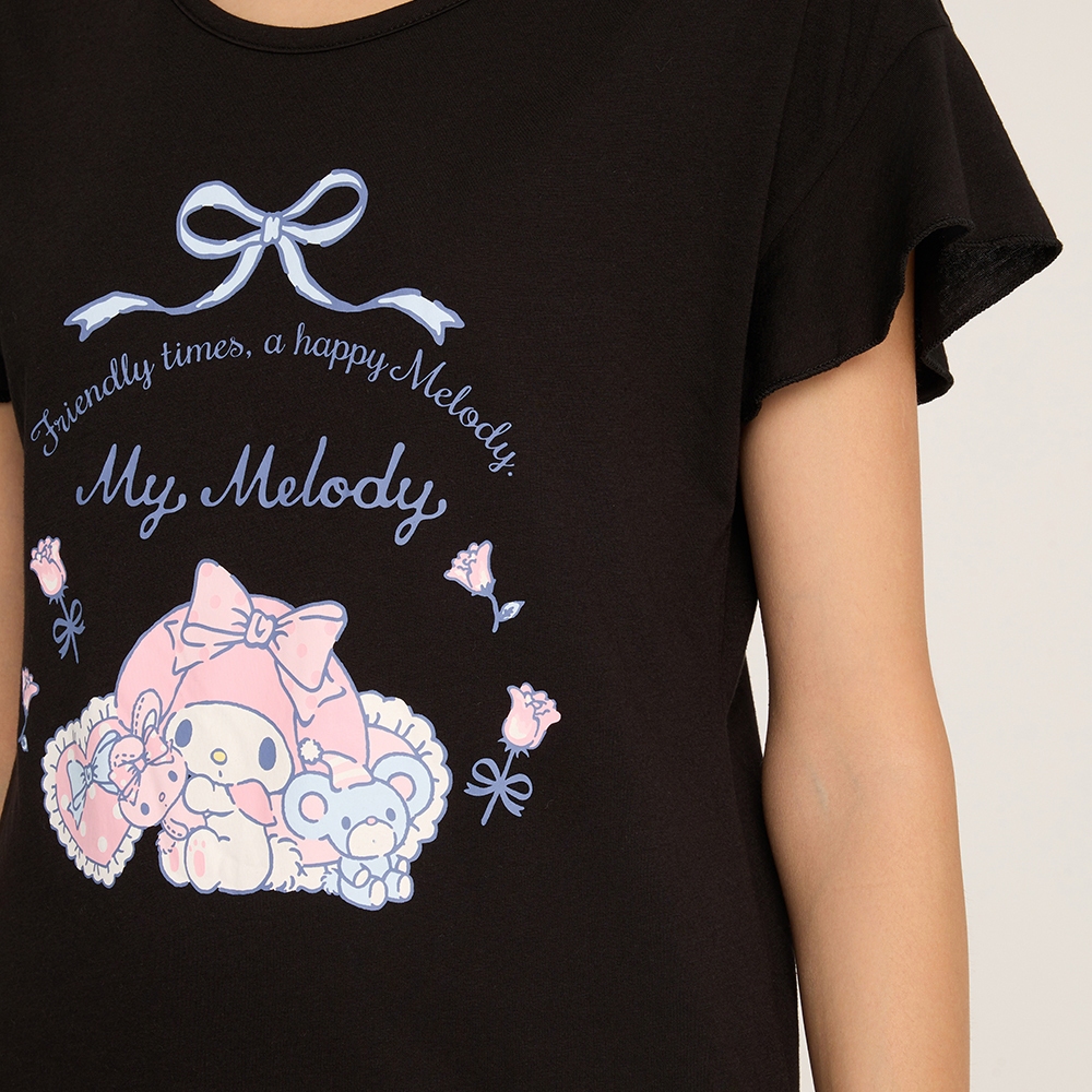 【Anden Hud】連身_美樂蒂系列.落肩荷葉短袖開叉睡衣(黑色-浪漫美樂蒂) 海外禁售