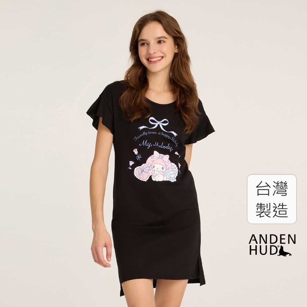 【Anden Hud】連身_美樂蒂系列.落肩荷葉短袖開叉睡衣(黑色-浪漫美樂蒂) 海外禁售S|M|L|XLPajamasAnden Hud 台灣製內著 官方旗艦店