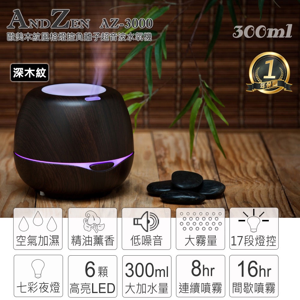 • 【 ANDZEN安得仁 】香薰機/水氧機(AZ-3000深木紋)+精油30ml x 1瓶 薰香機 加濕器 超音波 負離子