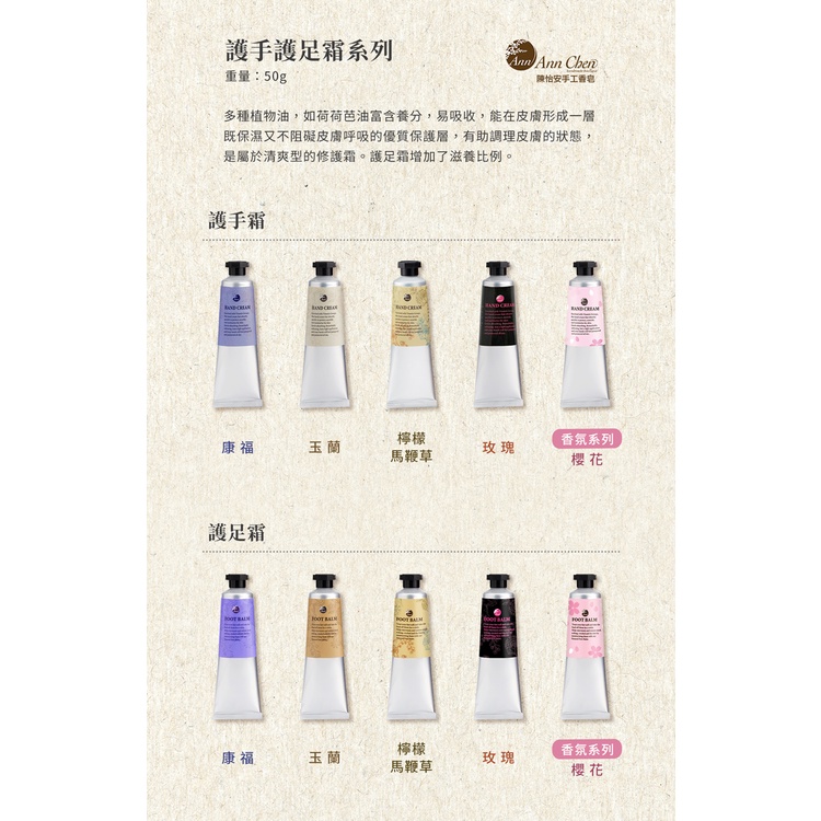 陳怡安手工皂-護手霜50g (櫻花/玫瑰/修護玉蘭/康福/檸檬馬鞭草)玫瑰|修護玉蘭|康福|檸檬馬鞭草|櫻花Hand CareAnnChen陳怡安手工皂(洗髮餅)-總代理旗艦館