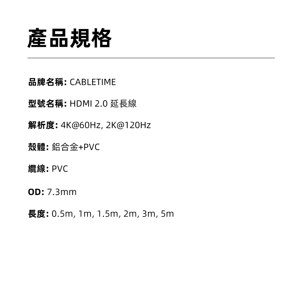 CABLETIME HDMI延長線 2.0版 公對母 4K60HZ0.5M|1M|1.5M|2M|3M~好架本舖~
