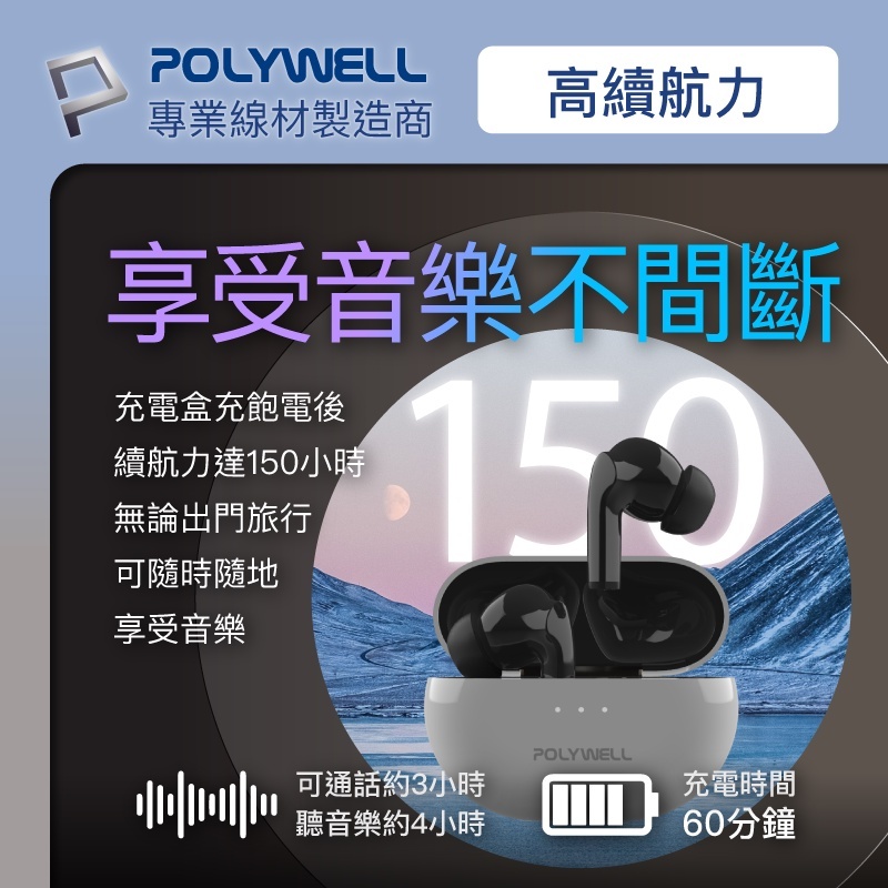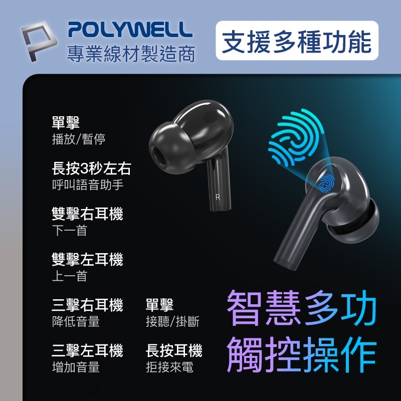POLYWELL 寶利威爾 藍芽耳機 耳機 無線藍牙主動式降噪耳機 高質感音效 耳機觸控式操作 USB-C充電倉設計黑色|白色|銀色AGOS購物