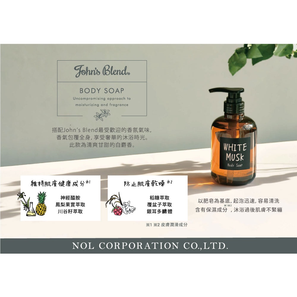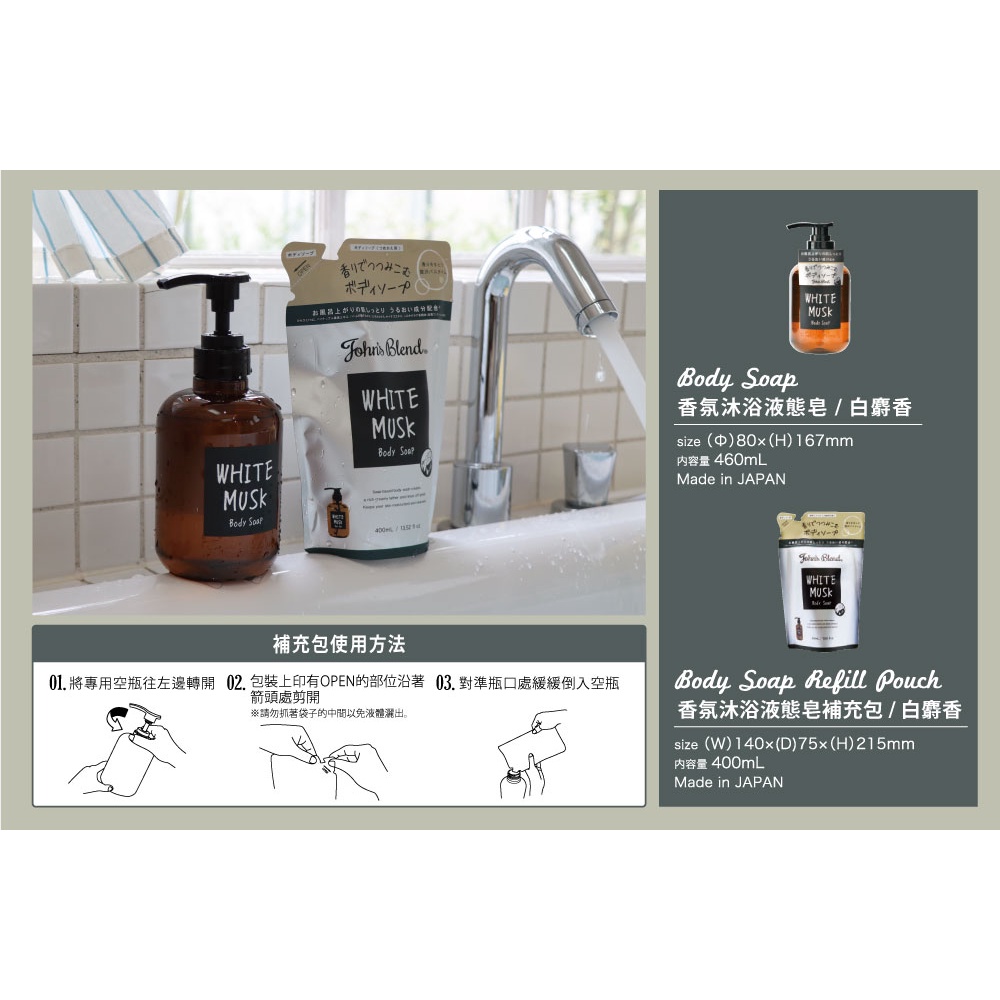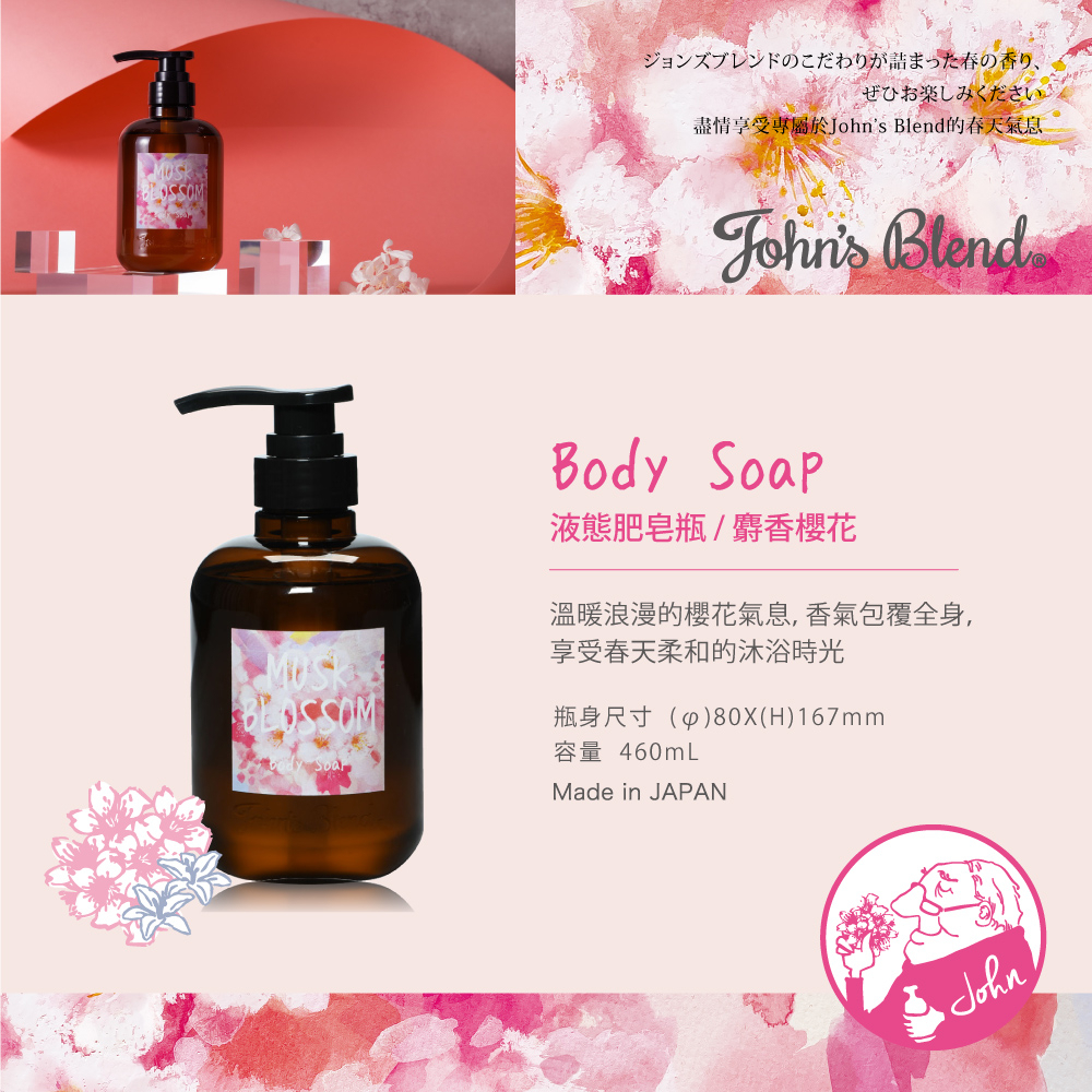 John’s Blend 香氛液態皂/沐浴露(瓶裝/補充包)-白麝香/麝香含羞草/麝香櫻花/橙麝香瓶裝(460mL/瓶)-白麝香|補充包(400mL/包)-白麝香|(瓶裝+補充包)-白麝香|瓶裝(300mL/瓶)-橙麝香|瓶裝(460mL/瓶)-麝香含羞草|瓶裝(460mL/瓶)-麝香櫻花Body Wash & SoapB&H 多立康保健食品、日本John’s Blend香氛、日用雜貨專賣店