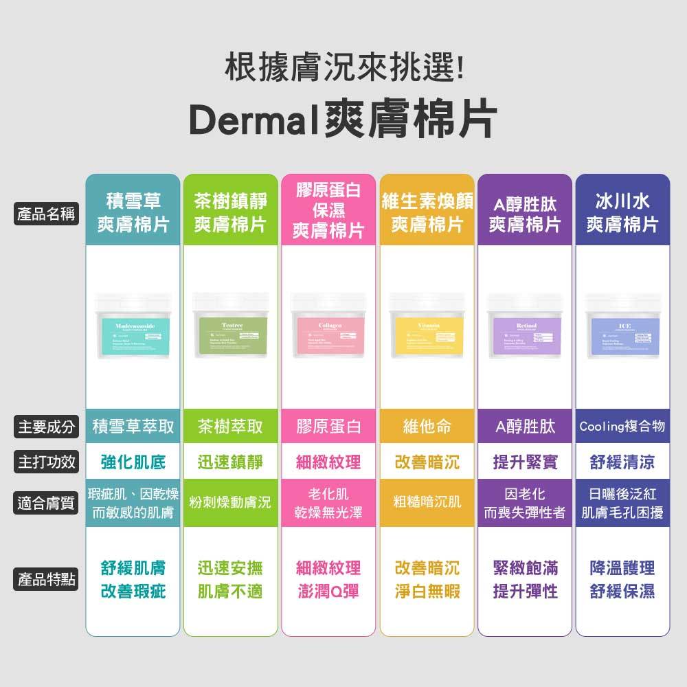 DERMAL 爽膚棉片120pcs 多款任選(積雪草|茶樹|膠原蛋白|維他命|A醇胜肽|冰川水)韓國韓妝積雪草爽膚棉-鎮靜舒緩|茶樹鎮靜爽膚棉-調理控油|膠原蛋白爽膚棉-緊緻彈力|維他命煥顏爽膚棉-美白透亮|A醇胜肽爽膚棉-撫平皺紋|冰川水爽膚棉-冰涼舒爽Face Mask & PacksBeauty box 美麗百寶箱