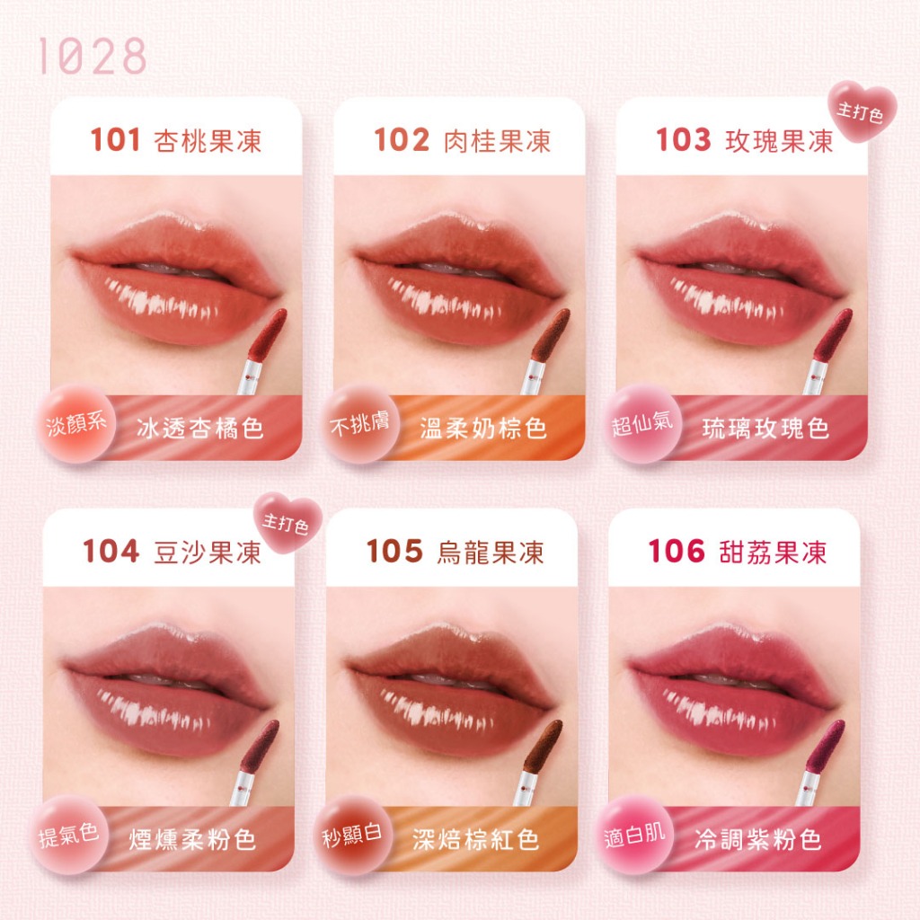 1028 唇唇欲凍持色水光唇釉101 杏桃果凍|102 肉桂果凍|103 玫瑰果凍|104 豆沙果凍|105 烏龍果凍|106 甜荔果凍Lips1028 官方旗艦館