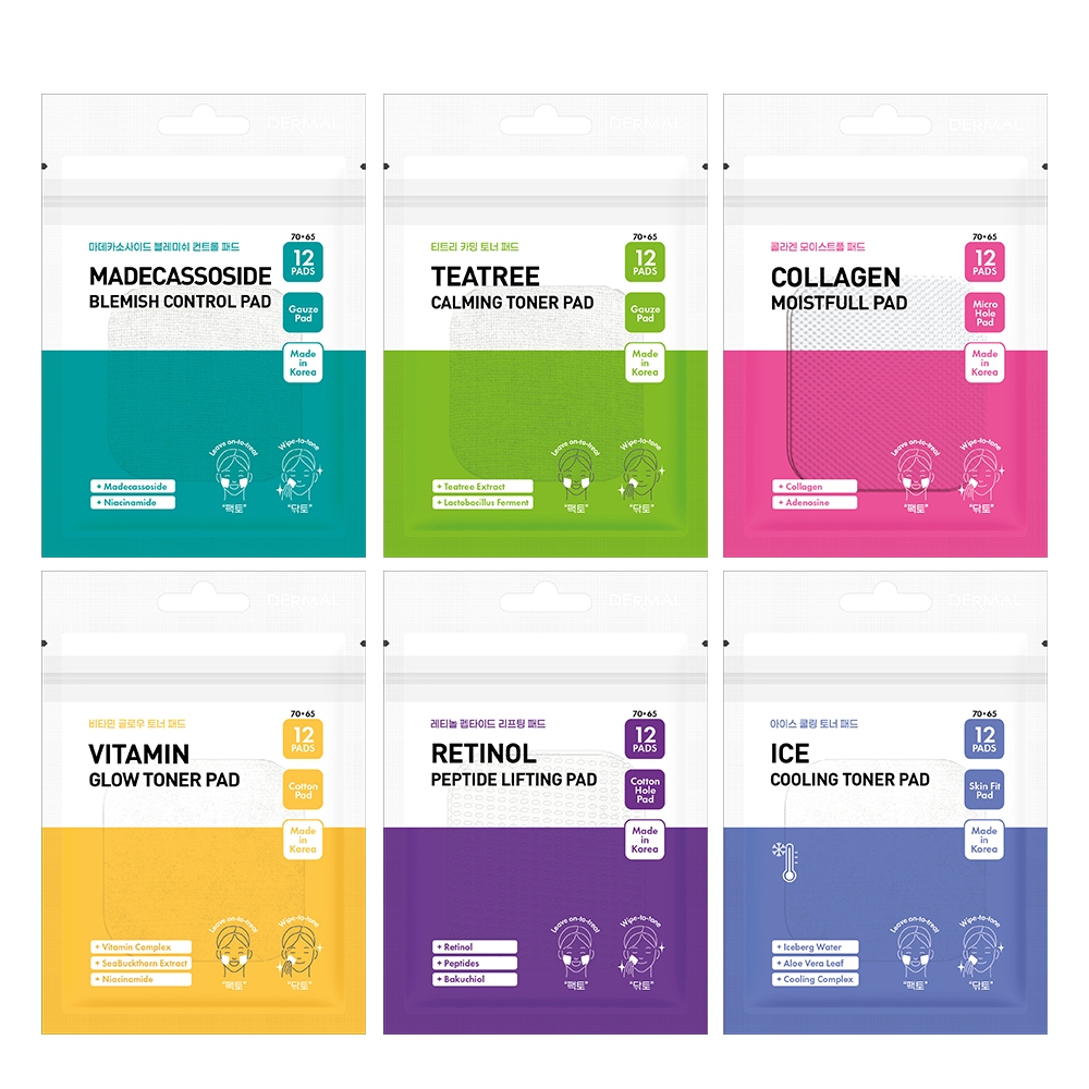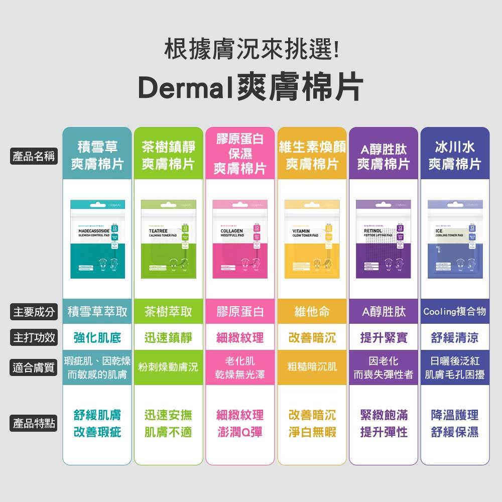 Dermal 爽膚棉片 12pcs 多款任選 (積雪草|茶樹|膠原蛋白|維他命|A醇胜肽|冰川水)韓國韓妝積雪草爽膚棉-鎮靜舒緩|茶樹鎮靜爽膚棉-調理控油|膠原蛋白爽膚-緊緻彈力|維他命煥顏爽膚棉-美白透亮|A醇胜肽爽膚棉-撫平皺紋|冰川水爽膚棉-冰涼舒爽Face Mask & PacksBeauty box 美麗百寶箱