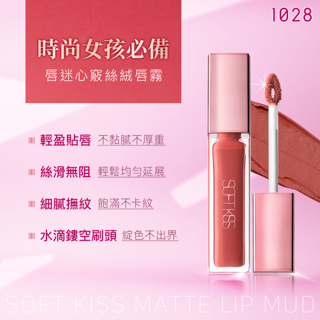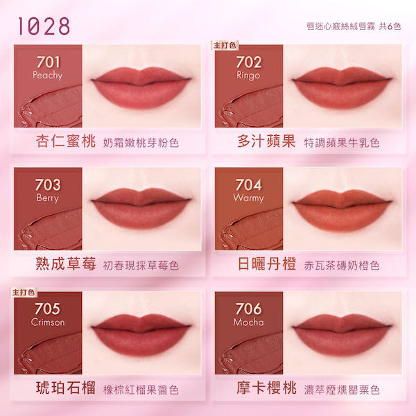 1028 唇迷心竅絲絨唇霧(效期至2026/3)701 杏仁蜜桃|702 多汁蘋果|703 熟成草莓|704 日曬丹橙|705 琥珀石榴|706 摩卡櫻桃Lips1028 官方旗艦館