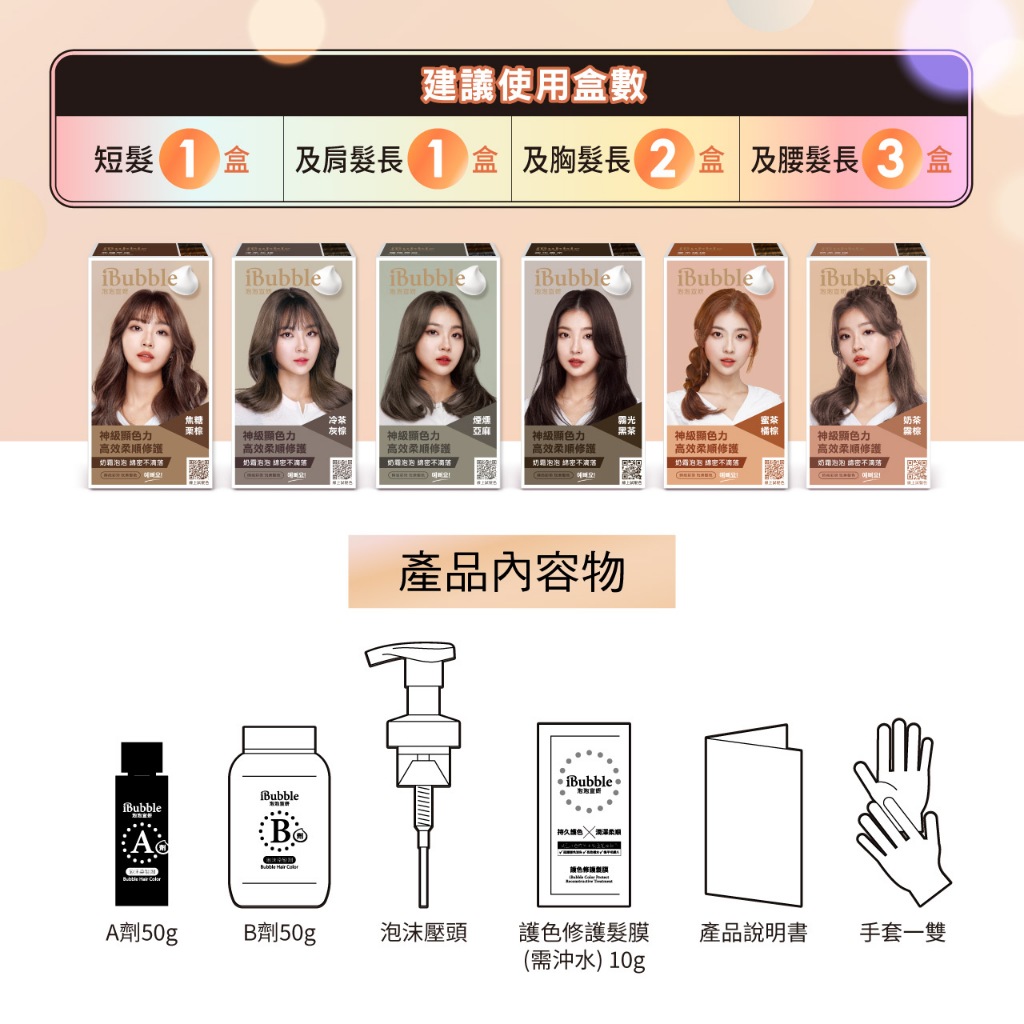 【美吾髮】iBubble泡泡宣妍 泡沫染髮劑(A劑&B劑50g) 多色任選(單盒) 泡泡染/韓國染/顯色/免漂冷茶灰棕X1,泡泡宣妍護色髮膜10ml|蜜茶橘棕X1,泡泡宣妍護色髮膜10ml|奶茶霧棕X1,泡泡宣妍護色髮膜10ml|冷光霧黑X1,泡泡宣妍護色髮膜10ml|煙燻亞麻X1,泡泡宣妍護色髮膜10ml|柔霧太妃X1,泡泡宣妍護色髮膜10ml|焦糖栗棕X1,泡泡宣妍護色髮膜10ml|楓糖紅棕X1,泡泡宣妍護色髮膜10ml|星幻藍黑X1,泡泡宣妍護色髮膜10ml|霧光黑茶X1,泡泡宣妍護色髮膜10ml|煙灰霧藍X1,泡泡宣妍護色髮膜10mlHair Colour【美吾髮購物網】