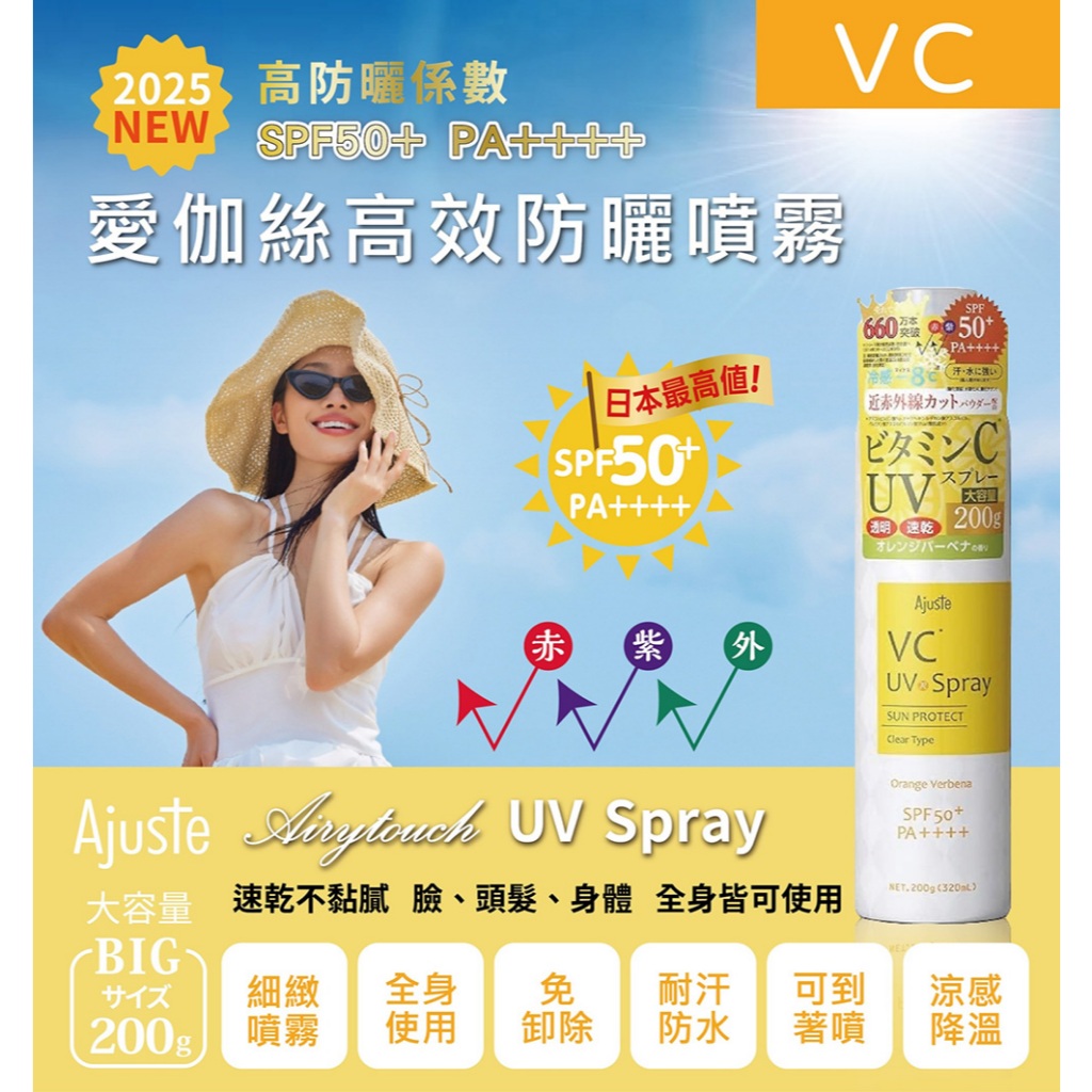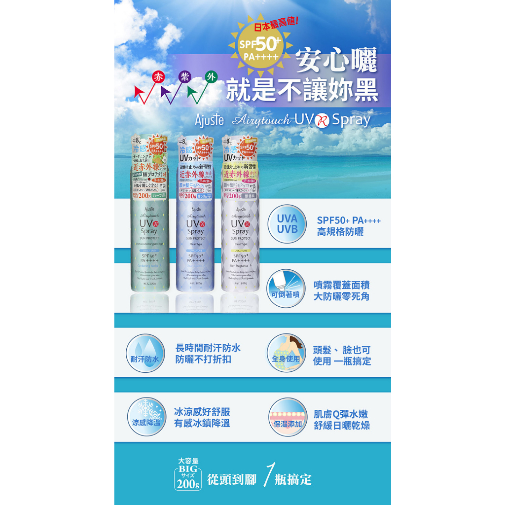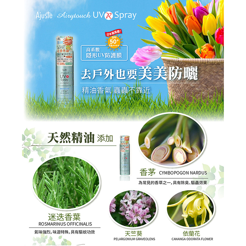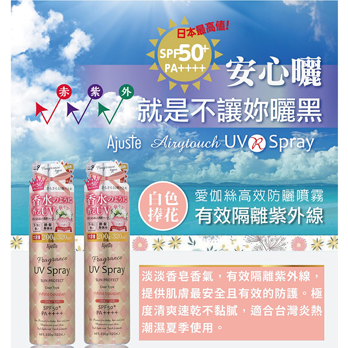Ajuste 愛伽絲 -8度C涼感高效防曬噴霧SPF50-精油香氣/皂香/無香氣/白色捧花/積雪草/維他命C 公司貨精油香氣(防蚊效果) 2027/2/27|香皂香氣 2027/1/31|無香氣 2027/2/27|維他命C 2028/2/27|白色捧花|🌱積雪草 2028/02/27Sun CareB&H 多立康保健食品、日本John’s Blend香氛、日用雜貨專賣店