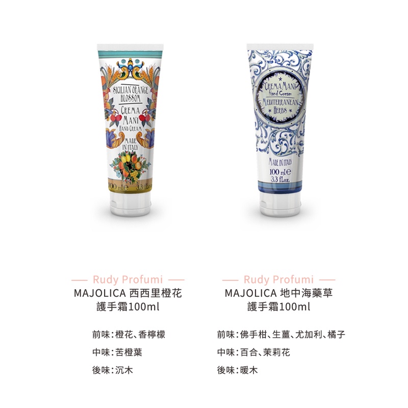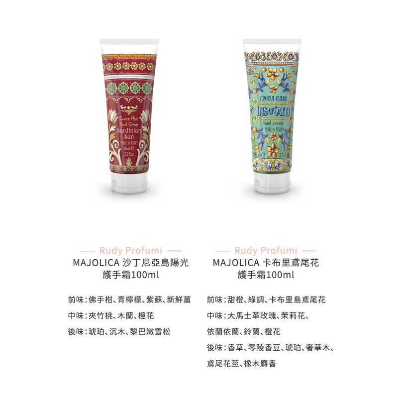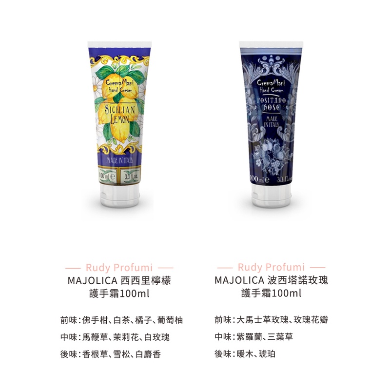 Rudy Profumi魯迪香氛世家 護手霜 100ml《BEAULY倍莉》 情人節禮物 手足保養 護手霜 送禮阿瑪爾菲牡丹|沙丁尼亞島|卡布里鳶尾花|波西塔諾玫瑰|牡丹花|玫瑰花|芙蓉花|義大利橄欖油|西西里檸檬|西西里橙花|地中海藥草|玉蘭花|陶米娜|薰衣草|橙花Hand CareBEAULY倍莉|精品香水美妝
