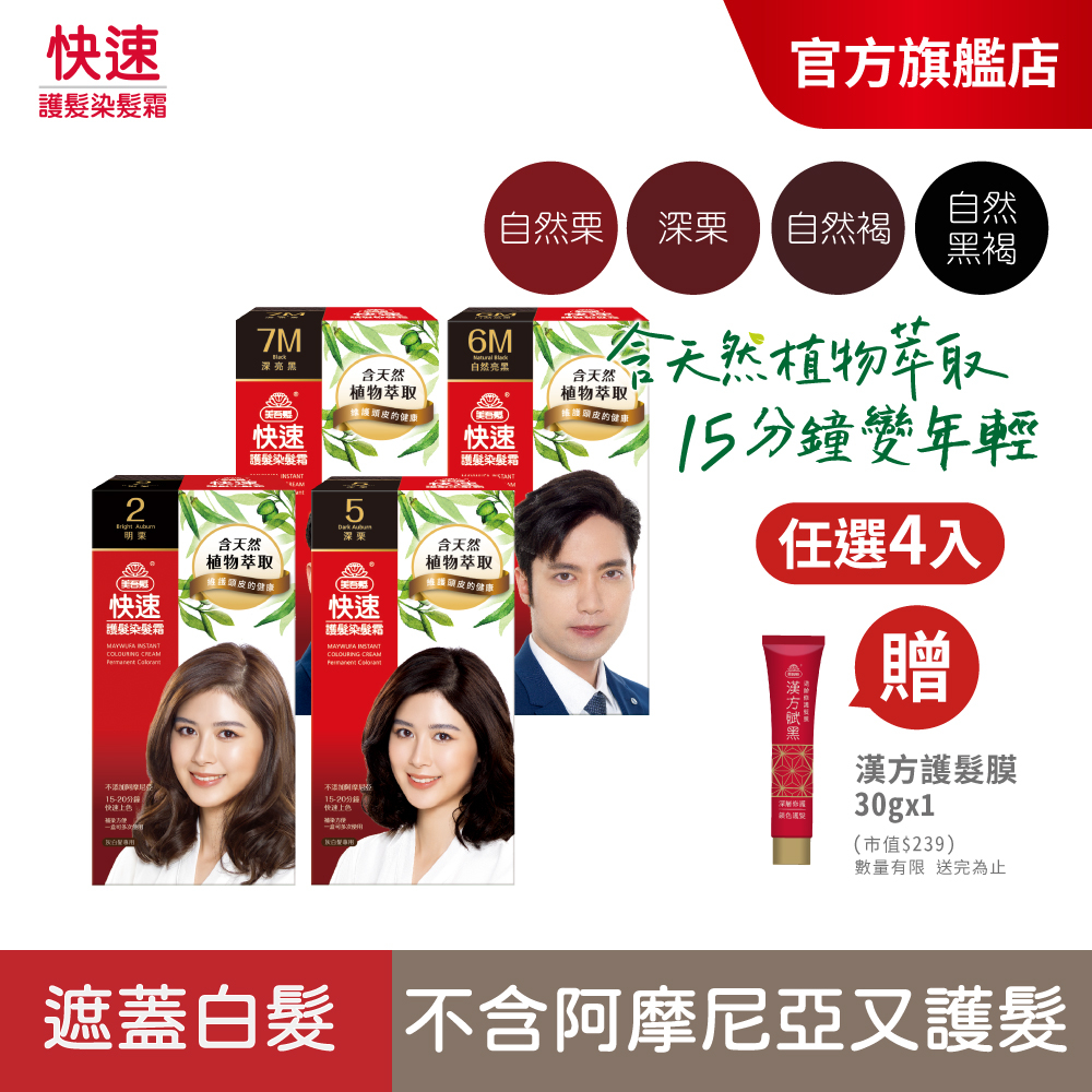 【美吾髮】快速護髮染髮霜_4入組(多色任選)蓋白染/植萃科技/15分鐘變年輕/灰白髮2明栗X3盒+3淺栗X1盒|6M自然亮黑X4盒|53亮澤紅棕X4盒|6自然褐X4盒|7自然黑褐X4盒|2明栗X4盒|7M深亮黑X4盒|3淺栗X4盒|4自然粟X4盒|5深栗X4盒|66深亞麻棕X4盒|66深亞麻棕X2盒+6M自然亮黑X2盒Hair Colour【美吾髮購物網】