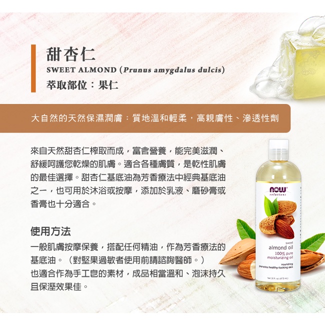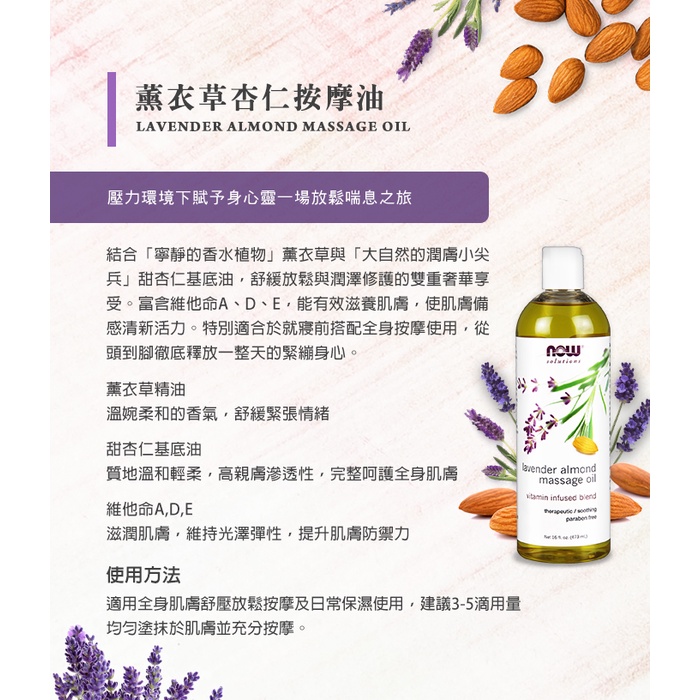 【NOW】熱銷大瓶基底油(甜杏仁油、椰子油、葡萄籽油、玫瑰按摩油、薰衣草杏仁按摩油、蓖麻油、植物甘油) 美國原裝