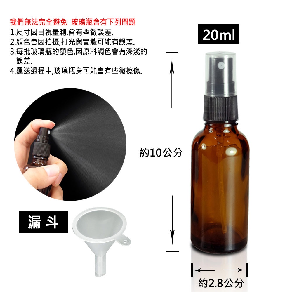 【 多件更優惠 】 20ml茶色玻璃噴霧瓶分裝瓶+漏斗x1入 玻璃噴霧瓶 分裝瓶 酒精玻璃 噴霧玻璃瓶【 多件更優惠 】 20ml茶色玻璃噴霧瓶分裝瓶+漏斗x1入 玻璃噴霧瓶 分裝瓶 酒精玻璃 噴霧玻璃瓶ANDZEN & WARM 品牌旗艦店 精油 純露 花水 水氧機 按摩油 擴香儀