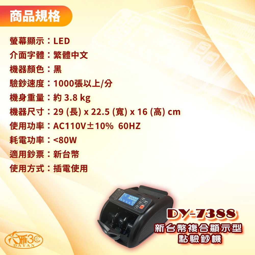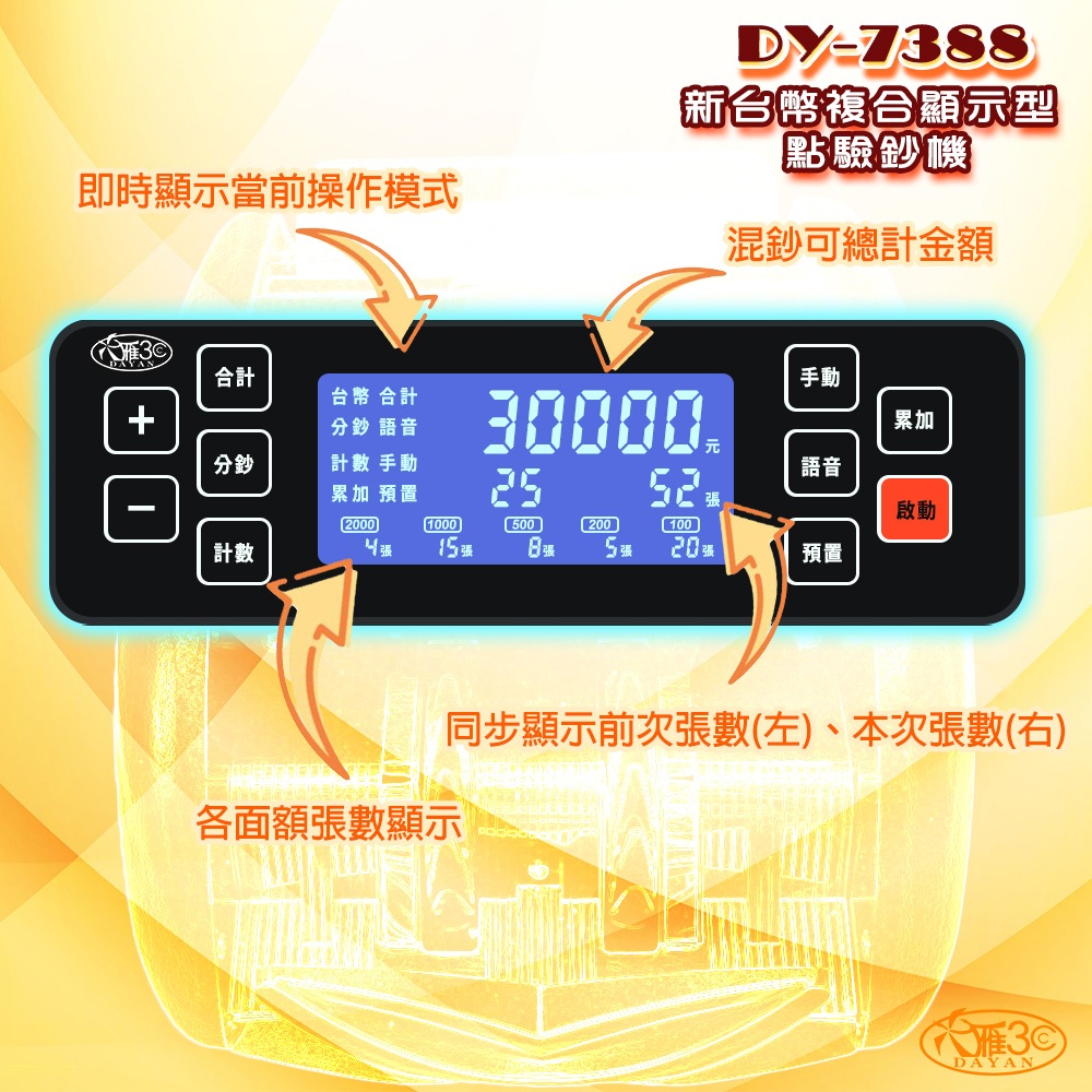 【大雁3C】DY-7388 新台幣複合顯示型點驗鈔機|超商免運|混鈔總計金額|點鈔機|驗鈔機|面額總計|7388DY-7388 新台幣複合顯示型點驗鈔機Money Counters【大雁3C 辦公室營業設備】