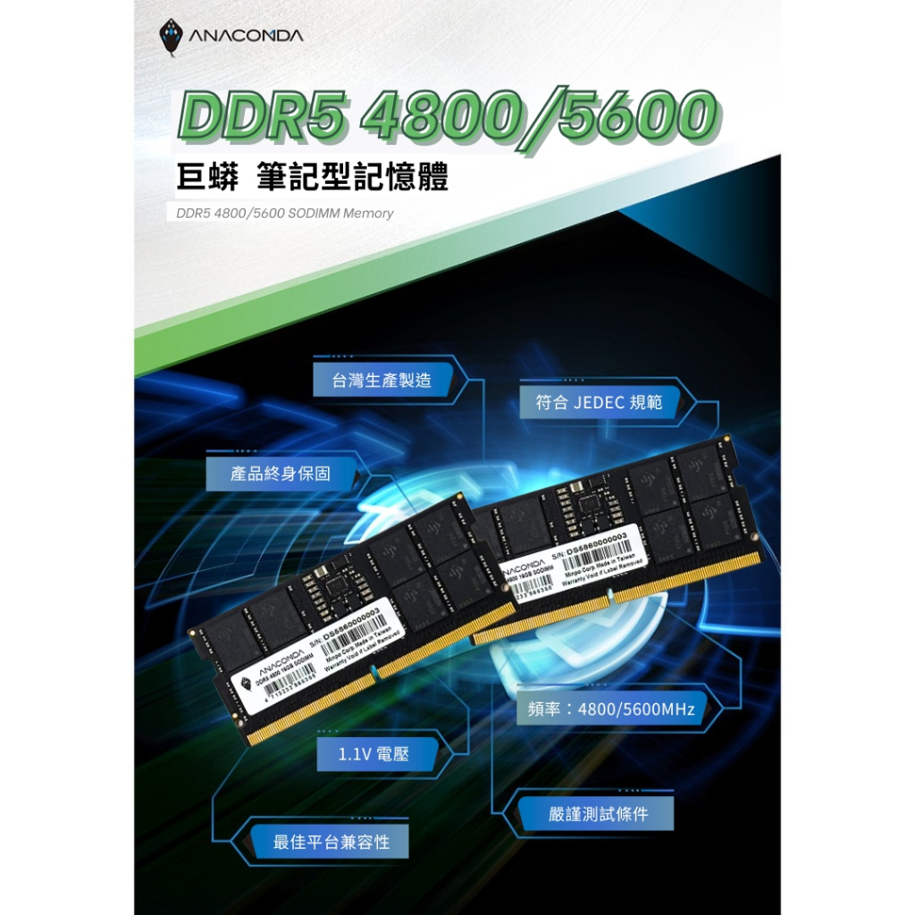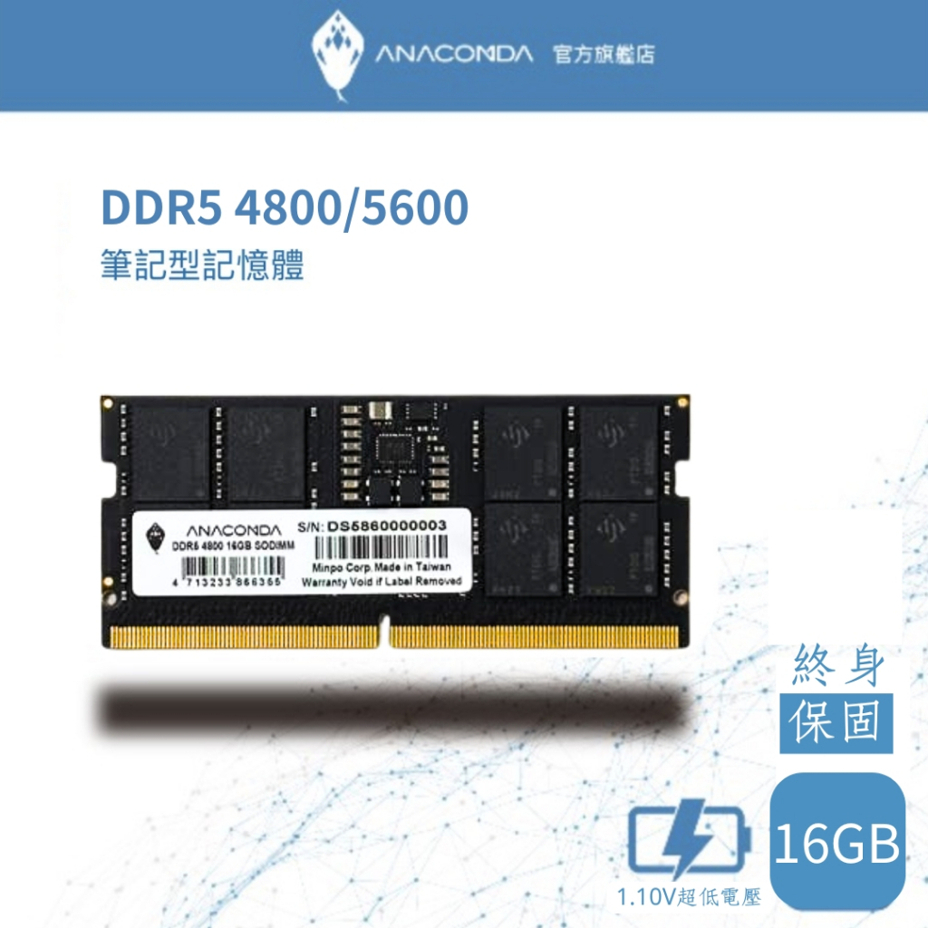 ANACOMDA 巨蟒 DDR5 4800 5600 16GB SODIMM 筆記型專用 有限終身保固 記憶體 D54800|5600RAMANACOMDA巨蟒 SSD固態硬碟&記憶體模組 官方旗艦店