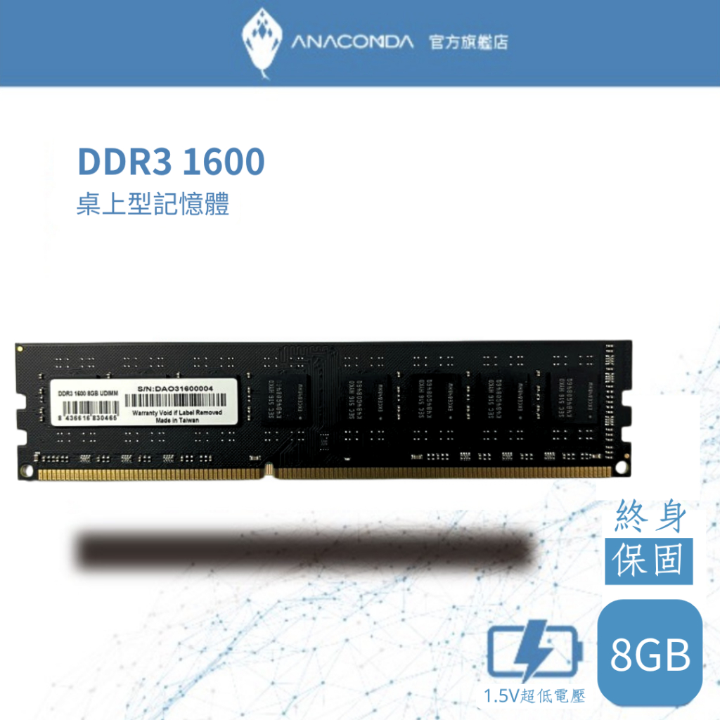 ANACOMDA 巨蟒 DDR3 1600 LODIMM 8GB 桌上型記憶體 有限終身保固 D3 桌機用 記憶體DDR3 LODIMMRAMANACOMDA巨蟒 SSD固態硬碟&記憶體模組 官方旗艦店