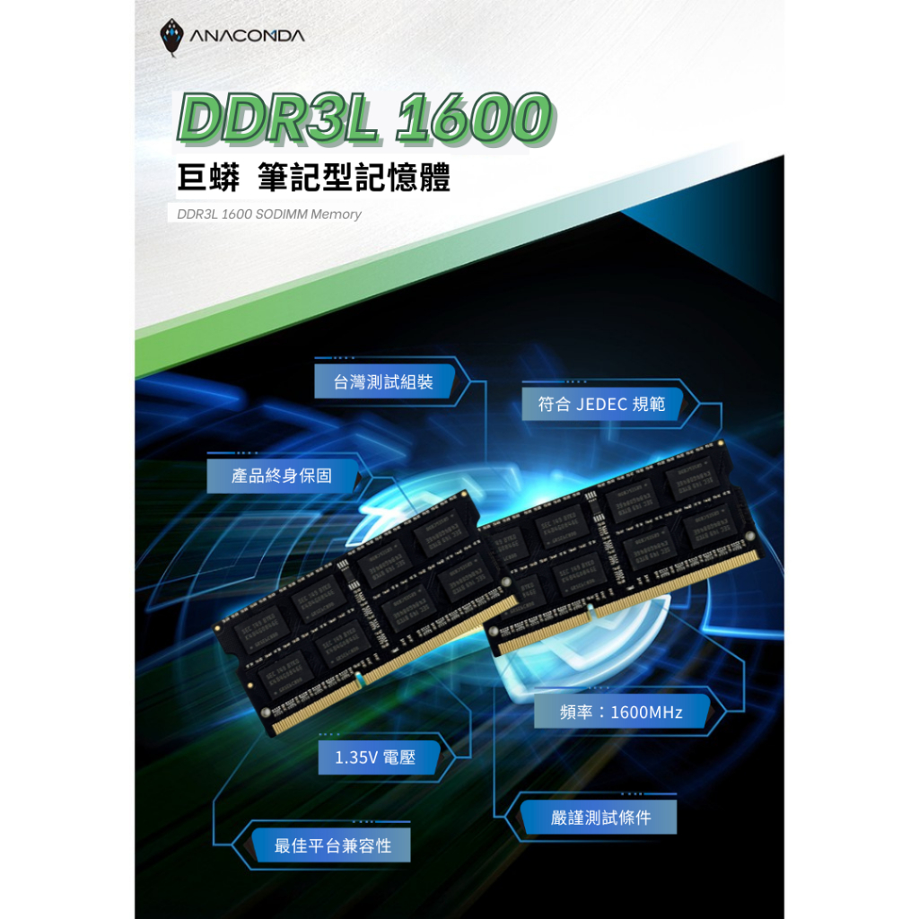 ANACOMDA 巨蟒 DDR3L 1600 SODIMM 8GB 筆記型專用記憶體 有限終身保固 記憶體 D3LDDR3L SODIMMRAMANACOMDA巨蟒 SSD固態硬碟&記憶體模組 官方旗艦店