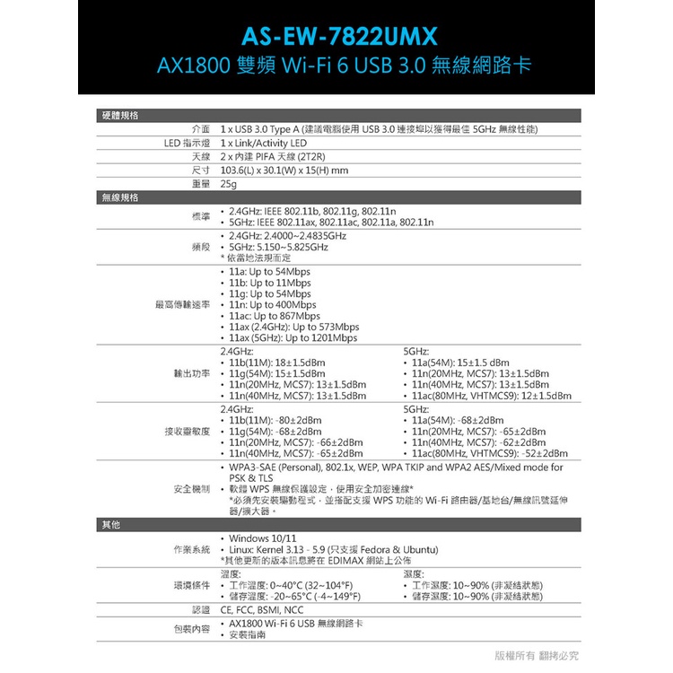 EDIMAX訊舟 7822UMX AX1800 Wi-Fi 6雙頻 USB 3.0無線網路卡【現貨】無線網卡 雙頻網卡EDIMAX訊舟 7822UMX AX1800 Wi-Fi 6雙頻 USB 3.0無線網路卡【現貨】無線網卡 雙頻網卡Wireless Adapters & Network Cardsaibo 3C生活館