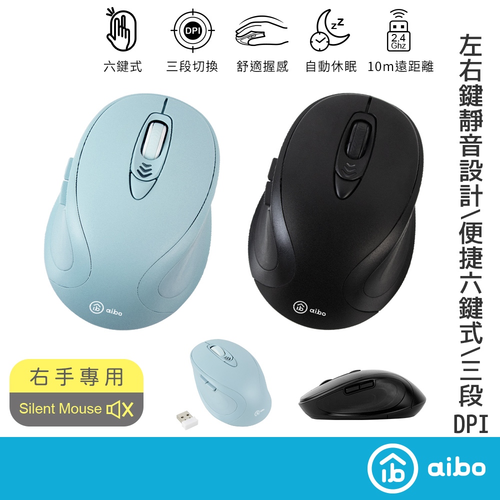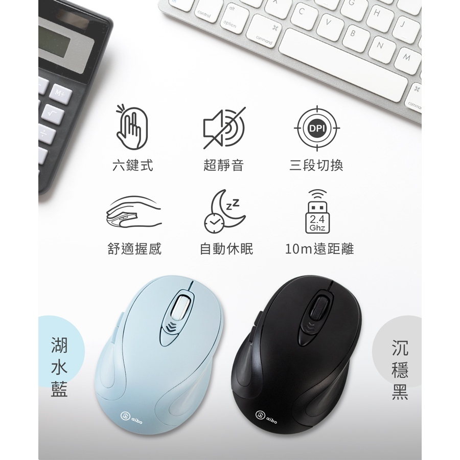 aibo 六鍵式 極靜音無線滑鼠【現貨】靜音滑鼠 無線滑鼠 自動休眠 免驅動 2.4G滑鼠 三段DPI 省電 辦公滑鼠沉穩黑|湖水藍Miceaibo 3C生活館