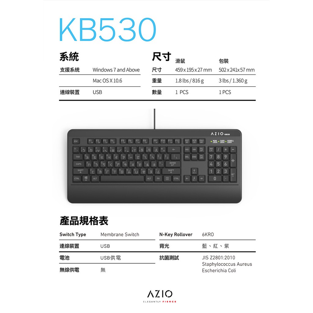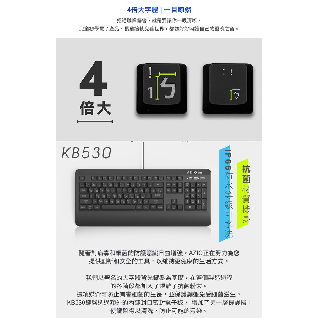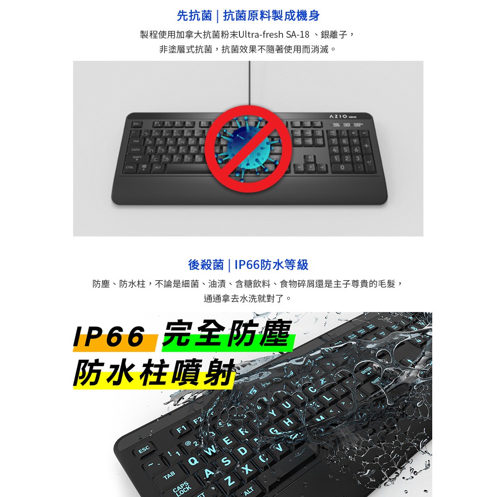 AZIO 原廠認證 抗菌可水洗 IP66等級 防水防油 KB530 薄膜式鍵盤 官方授權旗艦店中文KeyboardsAZIO 原廠官方授權 旗艦館