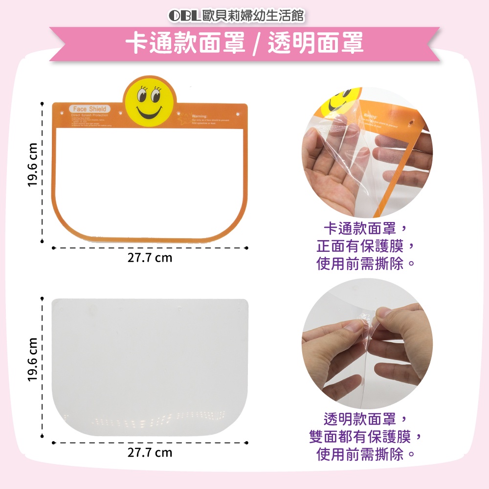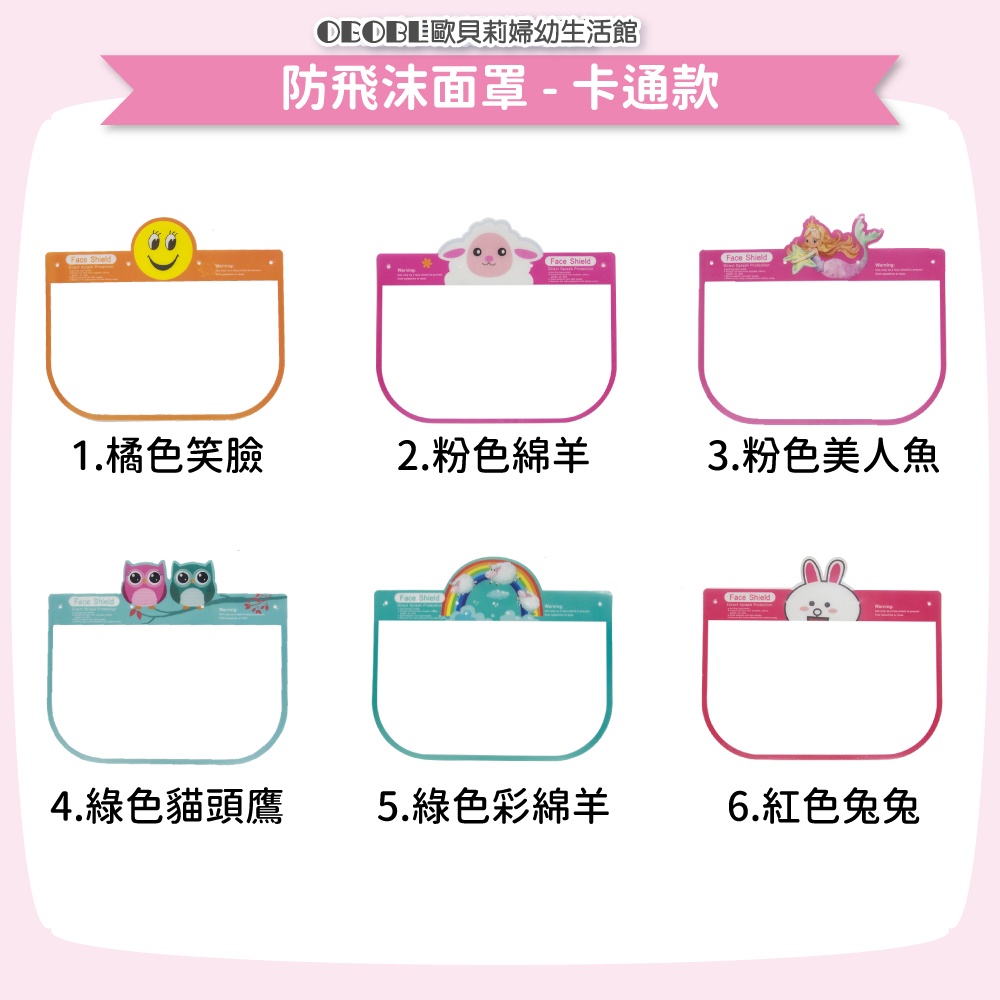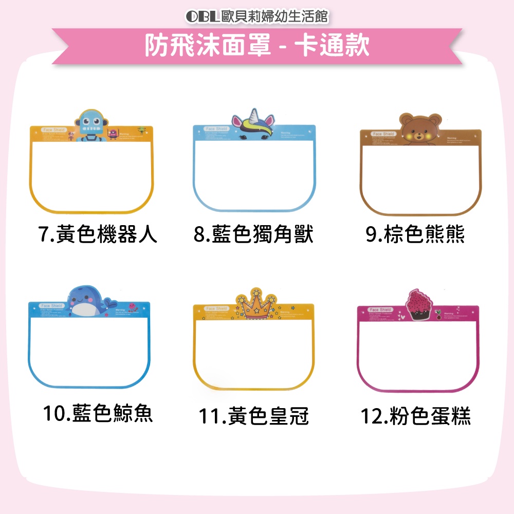 可掀可拆防飛沫面罩 卡通防飛沫面罩 透明面罩 防疫面罩 成人款 小孩款 《OBL歐貝莉》卡通款3.粉色美人魚(單售面罩 無支架)|卡通款6.紅色兔兔(單售面罩 無支架)|卡通款7.黃色機器人(單售面罩 無支架)|卡通款8.藍色獨角獸(單售面罩 無支架)|卡通款9.棕色熊熊(單售面罩 無支架)|卡通款10.藍色鯨魚(單售面罩 無支架)|粉色支架(單售支架 無面罩)|卡通款12.粉色蛋糕(單售面罩 無支架)|黑色支架(單售支架 無面罩)|透明面罩(單售面罩 無支架)|卡通款2.粉色綿羊(單售面罩 無支架)|卡通款4.綠色貓頭鷹(單售面罩 無支架)|卡通款5.綠色彩綿羊(單售面罩 無支架)|藍色支架(單售支架 無面罩)|卡通款1.橘色笑臉(單售面罩 無支架)|卡通款11.黃色皇冠(單售面罩 無支架)Masks【OBL 歐貝莉】歐貝莉婦幼生活館