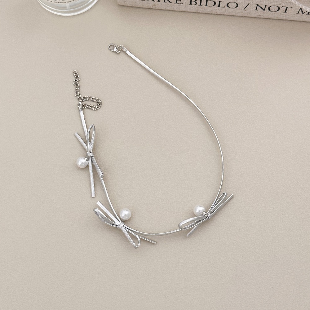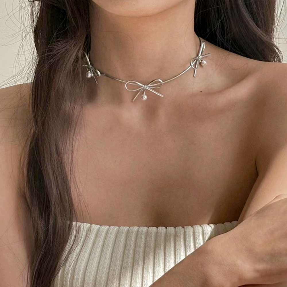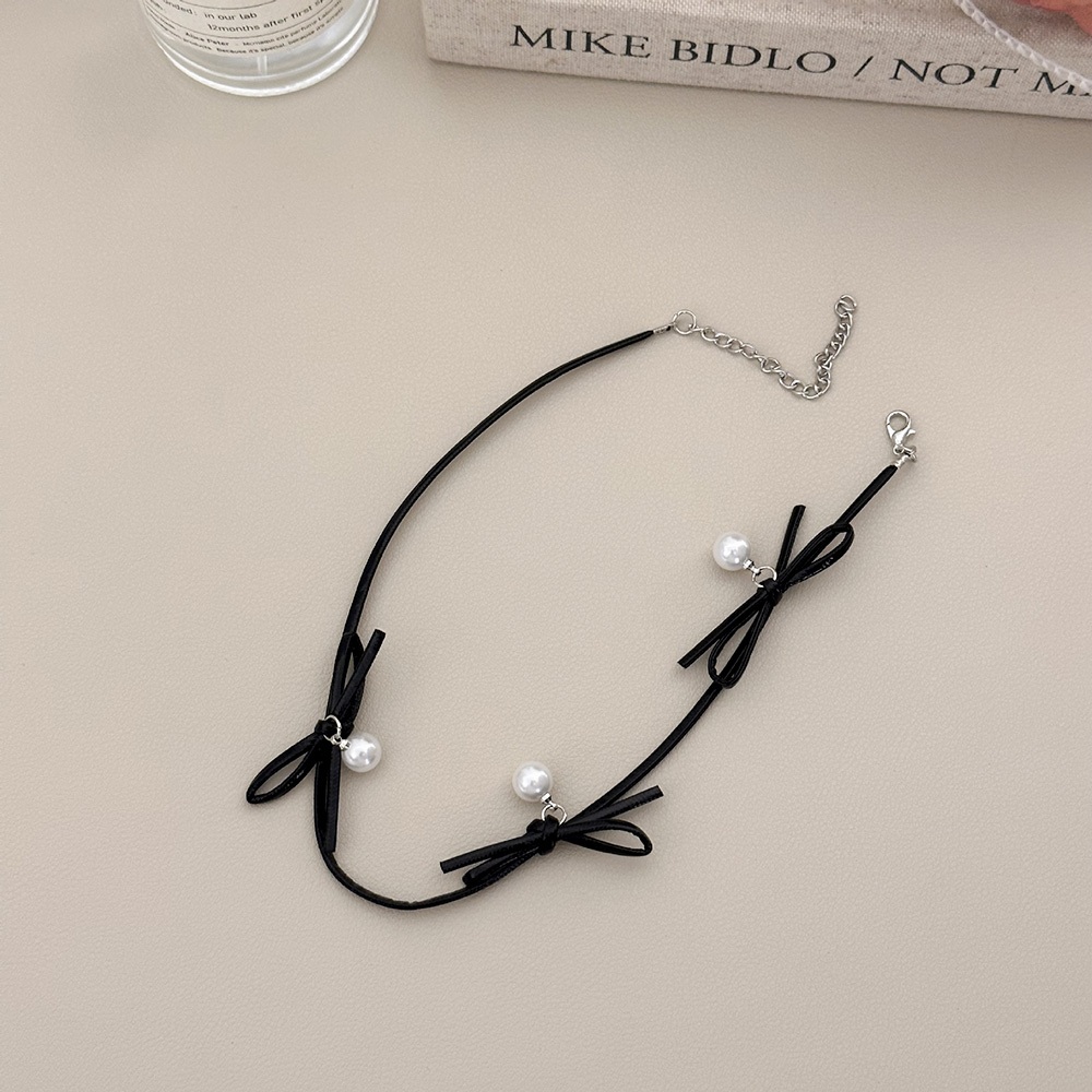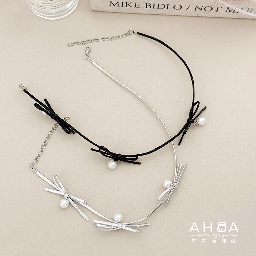 AHUA 阿華有事嗎 芭蕾風蝴蝶結珍珠頸鍊 E0110氣質 百搭 簡約 短鍊 項鍊黑色|銀色AHUA 韓國襪子品牌旗艦店