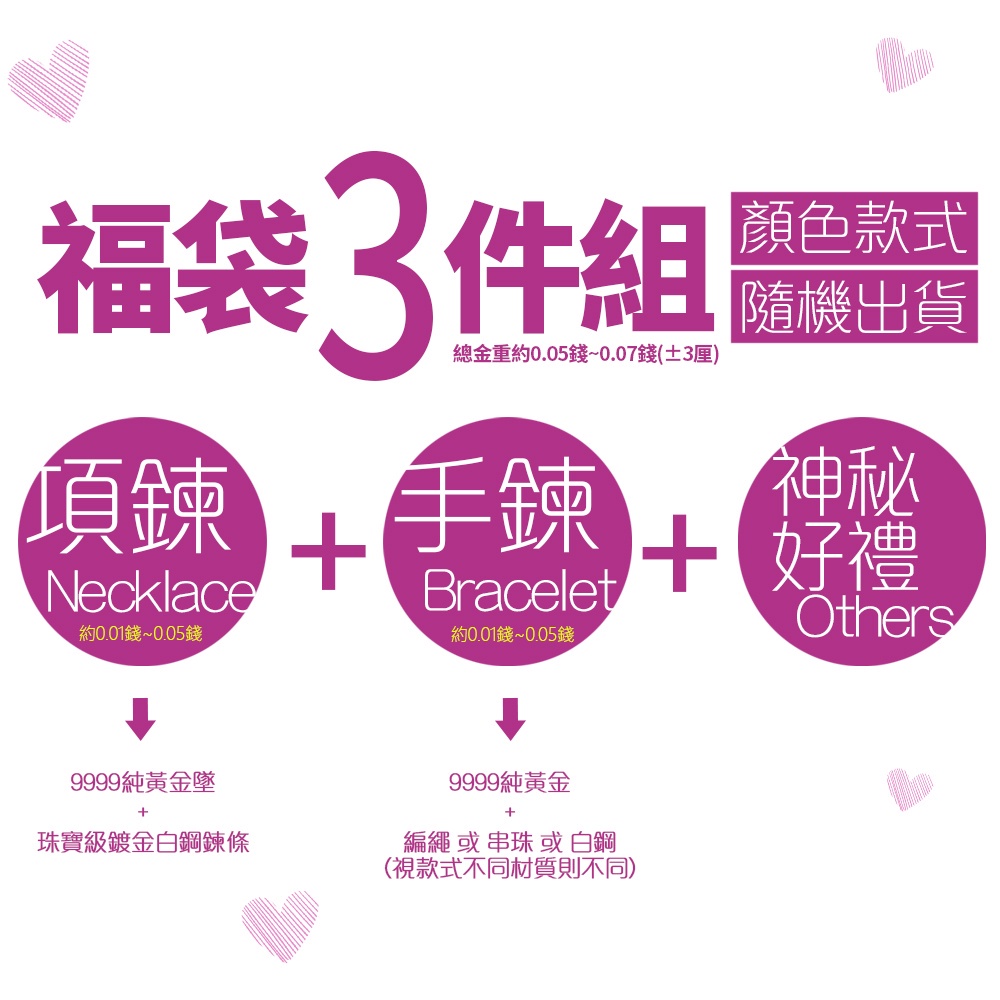 BIGO必果珠寶金飾 黃金福袋三件組 黃金手鍊+黃金墜飾(金重共約0.05~0.07錢±3厘)隨機出貨Platinum & K GoldBigo必果珠寶金飾