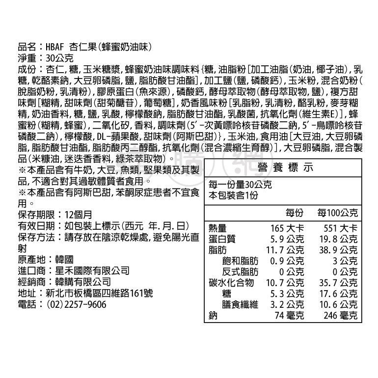韓國HBAF 杏仁果(蜂蜜奶油味)30g【韓購網】韓國HBAF 杏仁果(蜂蜜奶油味)30g【韓購網】Nuts《韓購網》KOREA SHOP韓國專賣店