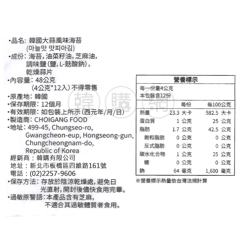 韓國MATFIA GIM 大蒜風味海苔48g(4g*12入)【韓購網】黑手黨蒜香風味海苔