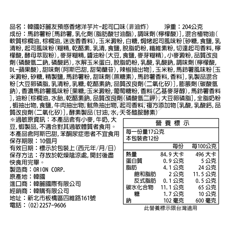 韓國好麗友 預感香烤洋芋片(起司味)204g(17gX12)【韓購網】韓國好麗友 預感香烤洋芋片(起司味)204g(17gX12)【韓購網】Chips & Crisps《韓購網》KOREA SHOP韓國專賣店