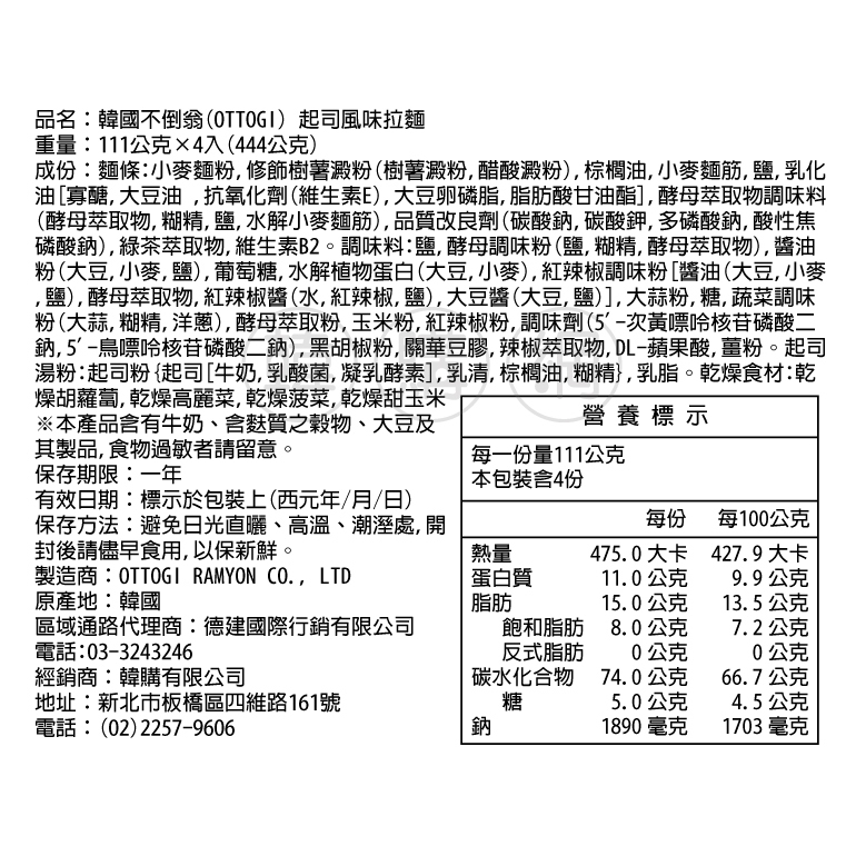 韓國不倒翁 起司風味拉麵444g(111gX4入)(2026.05.08有效)【韓購網】韓國不倒翁 起司風味拉麵444g(111gX4入)(2026.05.08有效)【韓購網】Instant Noodles《韓購網》KOREA SHOP韓國專賣店