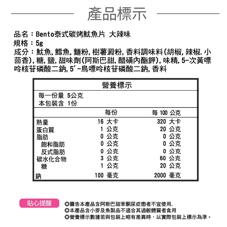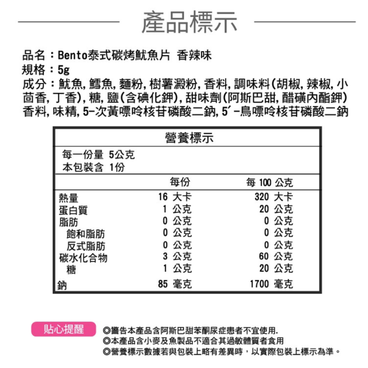 Bento 泰式碳烤魷魚片 5g 大辣味 香辣味 零食 點心 魷魚片 魷魚絲 魷魚捲 香魷片 【小麥購物】【A148】大辣味(5g)|香辣味(5g)Dried Snacks 小麥購物
