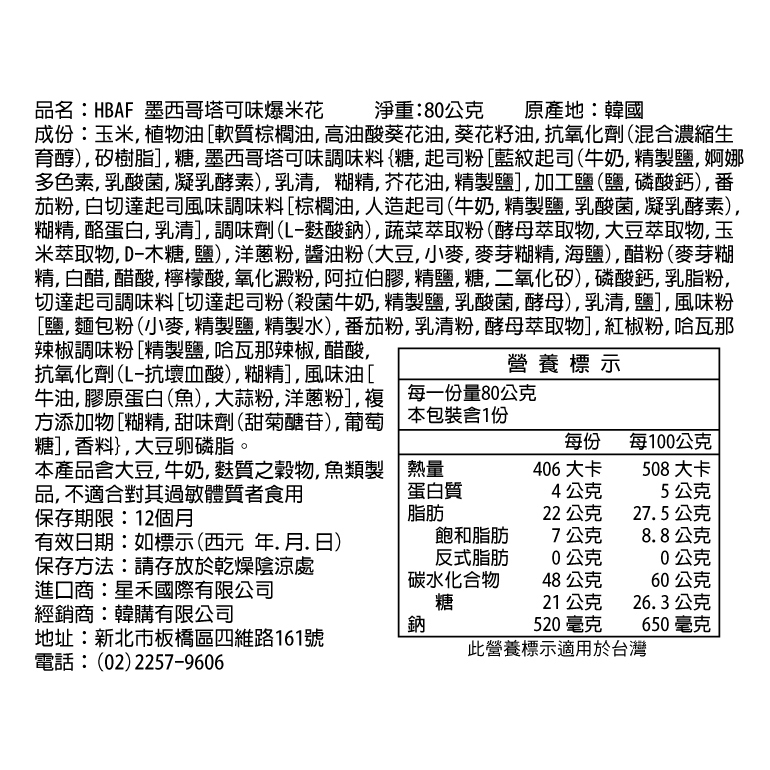HBAF 墨西哥塔可味爆米花80g【韓購網】HBAF 墨西哥塔可味爆米花80g【韓購網】Popcorn《韓購網》KOREA SHOP韓國專賣店
