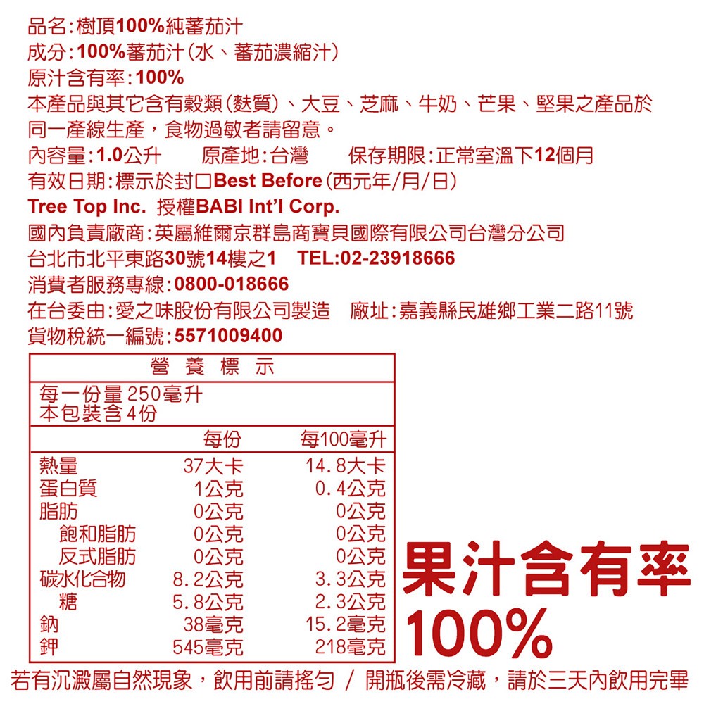 【TREE TOP樹頂】100%純蕃茄汁 1L 晶鑽包 x10 箱購100%蕃茄汁 1L*10|單筆限一組Juice & Juice VinegarBABI寶貝國際 旗艦店