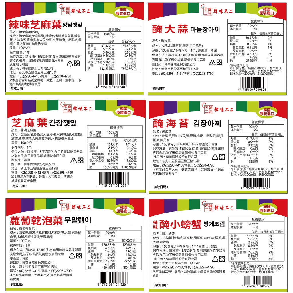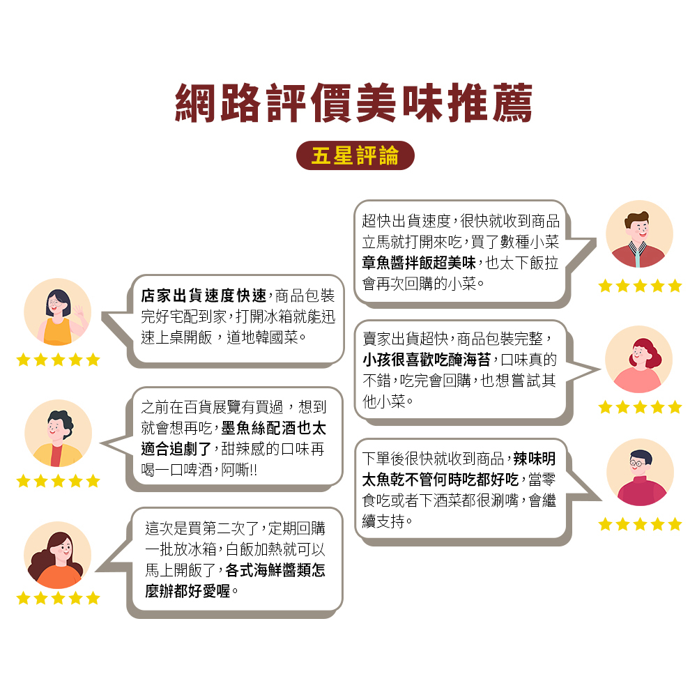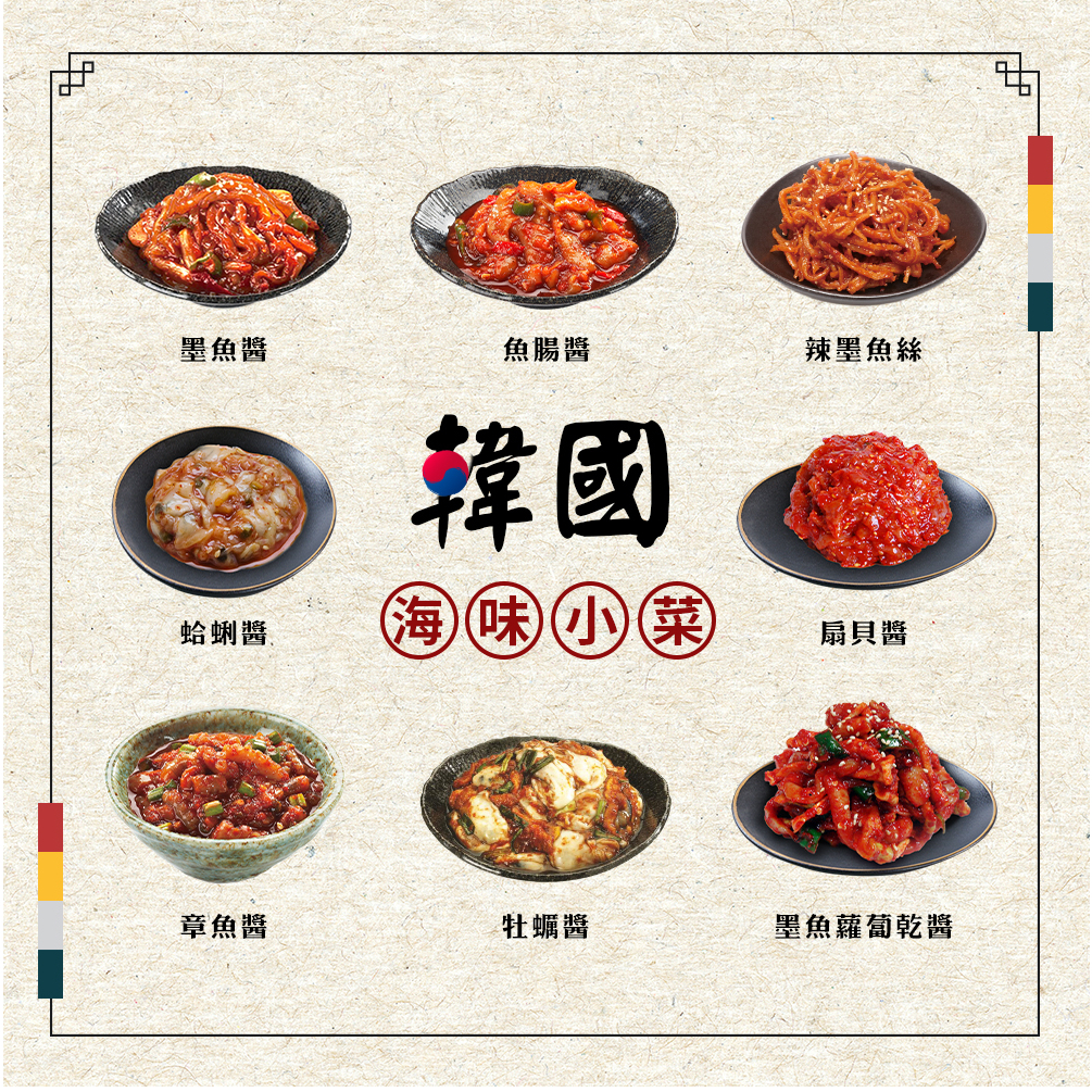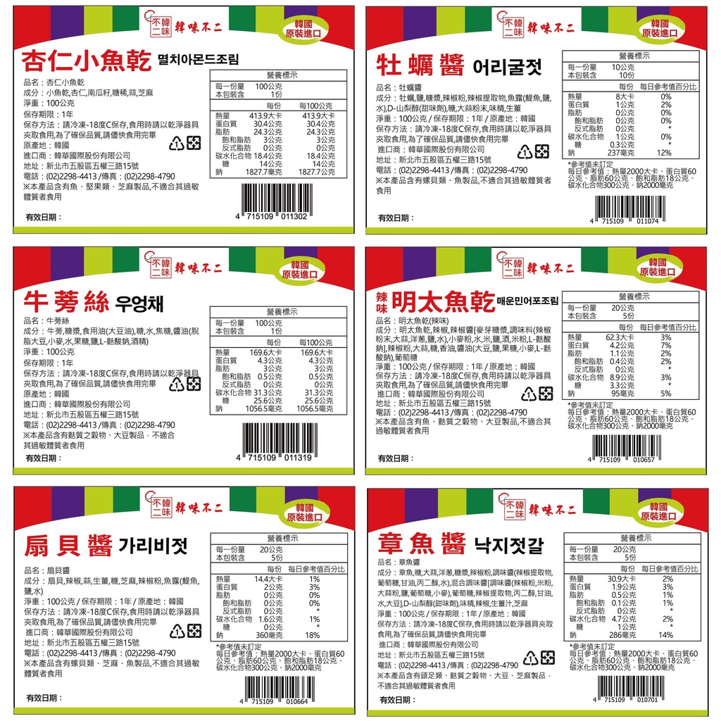 【韓味不二】韓國道地小菜100g 任選5入 共18種 章魚醬 墨魚醬 墨魚絲 芝麻葉 韓國進口直送章魚醬 *5|明太魚乾(辣味) *5|墨魚醬 (100g/包) *5|辣魚脯乾 (100g/包) *5|魚脯絲 *5|口味任選*5(備註給賣家)|醬油芝麻葉 *5|辣墨魚絲 *5|扇貝醬 (100g/包) *5|牛蒡絲 *5|辣醃芝麻葉 *5|牡蠣醬 *5|杏仁小魚乾 *5|蛤蠣醬(辣味) *5|辣醃小螃蟹 *5|醃海苔 (100g/包) *5|墨魚蘿蔔乾泡菜 (100g/包)*5|蘿蔔乾泡菜 (100g/包)*5|明太魚腸醬 (100g/包)*5Processed Meat & Seafood【韓味不二】 BK SHOP