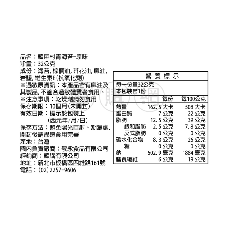 韓屋村 青海苔(原味)32g(2026.04.26有效)【韓購網】