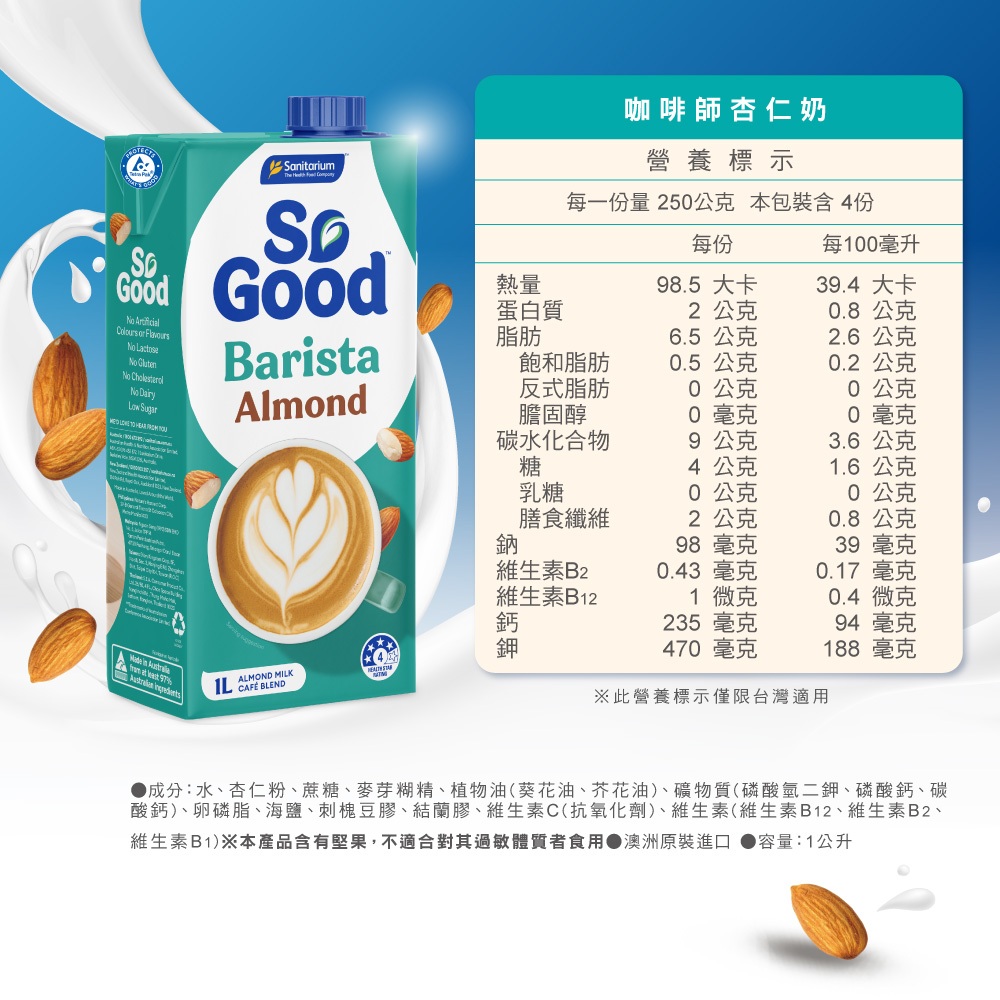【Sanitarium So Good】澳洲原裝進口植物奶|Barista咖啡師|杏仁奶1L|官方直營咖啡師杏仁奶1L|超取限6罐Non-dairy MilkACE Family健康家庭官方旗艦店