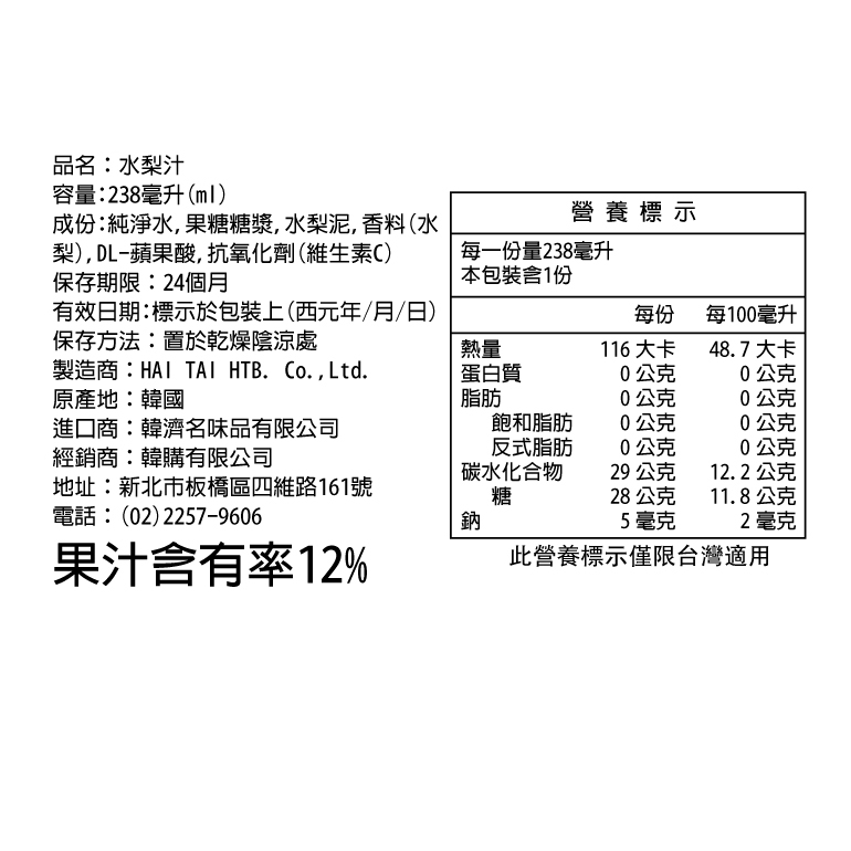 韓國HAITAI海太水梨汁飲料禮盒(238mlX12入)【韓購網】《超取限1盒,2盒以上請選宅配》超取限1盒,2盒以上請選宅配Juice & Juice Vinegar《韓購網》KOREA SHOP韓國專賣店