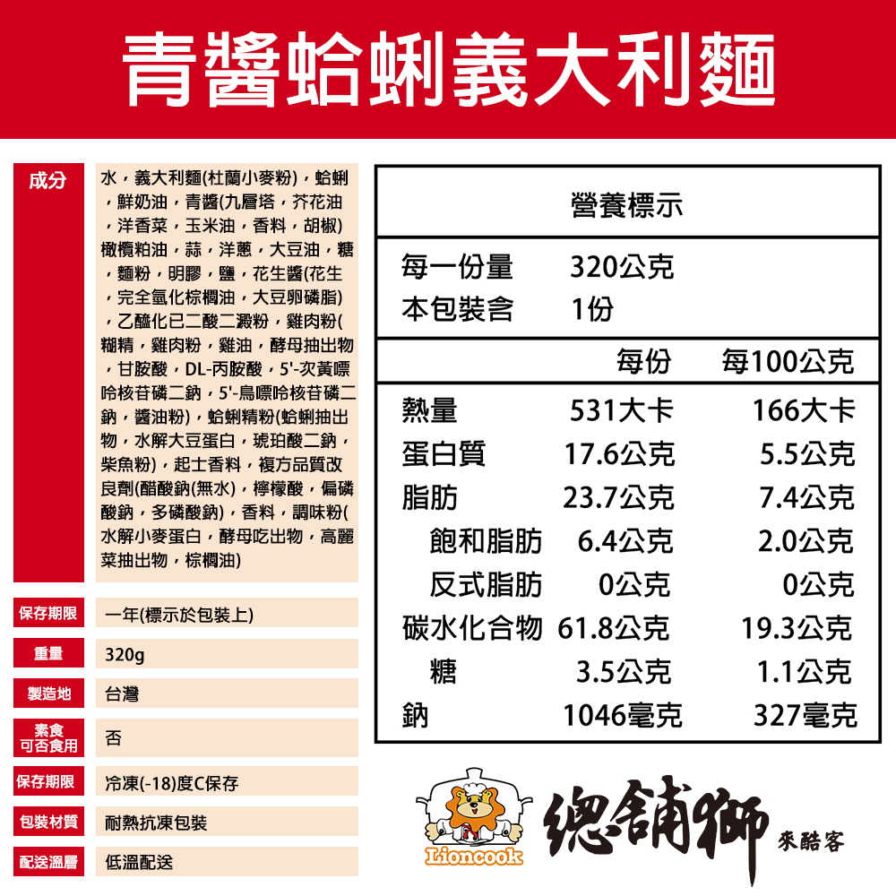 【總舖獅Lioncook】青醬蛤蜊義大利麵 (320g)【總舖獅Lioncook】青醬蛤蜊義大利麵 (320g)Pasta【官方】總舖獅來酷客 lioncook_official_shop