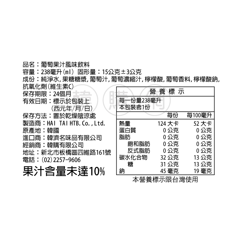 韓國HAITAI海太 葡萄果汁風味飲料238ml【韓購網】韓國HAITAI海太 葡萄果汁風味飲料238ml【韓購網】Juice & Juice Vinegar《韓購網》KOREA SHOP韓國專賣店