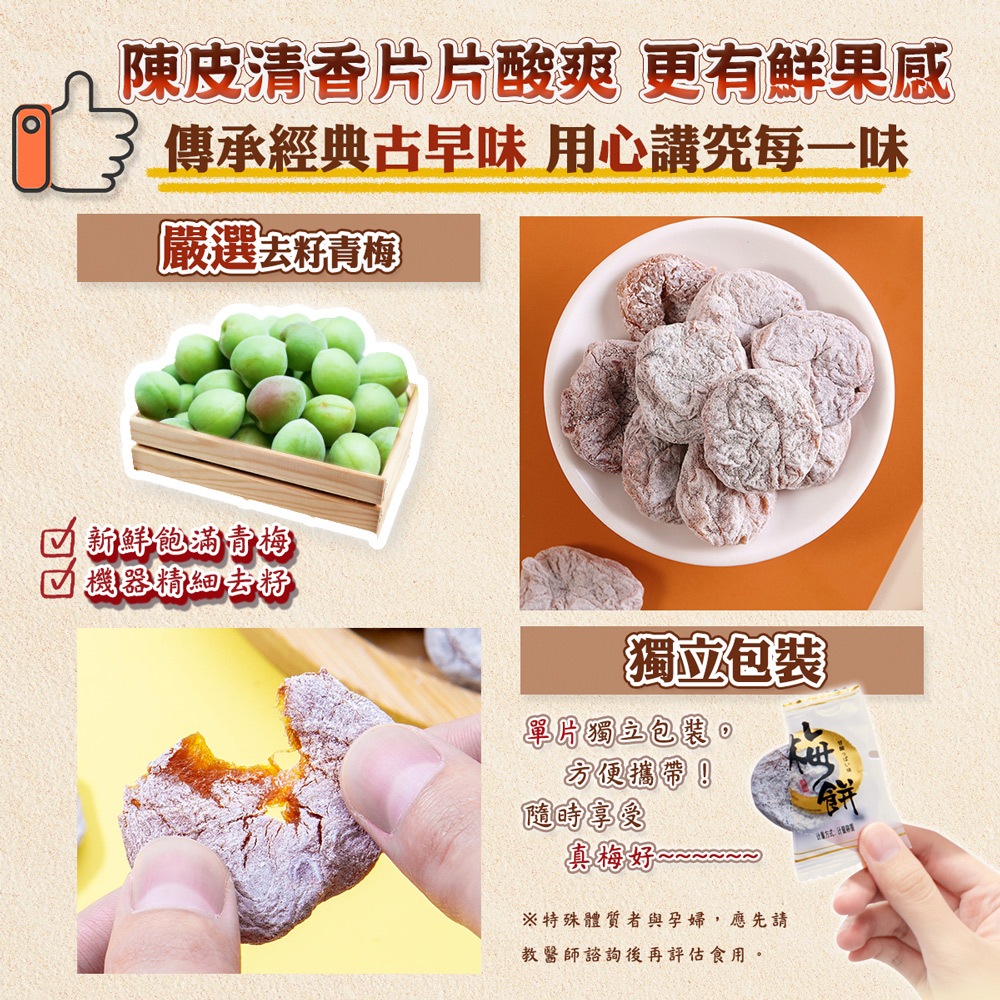 【蔘大王】陳皮無籽梅肉(梅餅) Q梅▪梅子▪青梅▪蜜餞▪乾梅肉▪飯前開胃▪飯後幫助消化▪酸甜不膩▪單顆包裝#W3082【蔘大王】陳皮無籽梅肉(梅餅) Q梅▪梅子▪青梅▪蜜餞▪乾梅肉▪飯前開胃▪飯後幫助消化▪酸甜不膩▪單顆包裝#W3082Dried Snacks【蔘大王】鮮人蔘藥膳食材