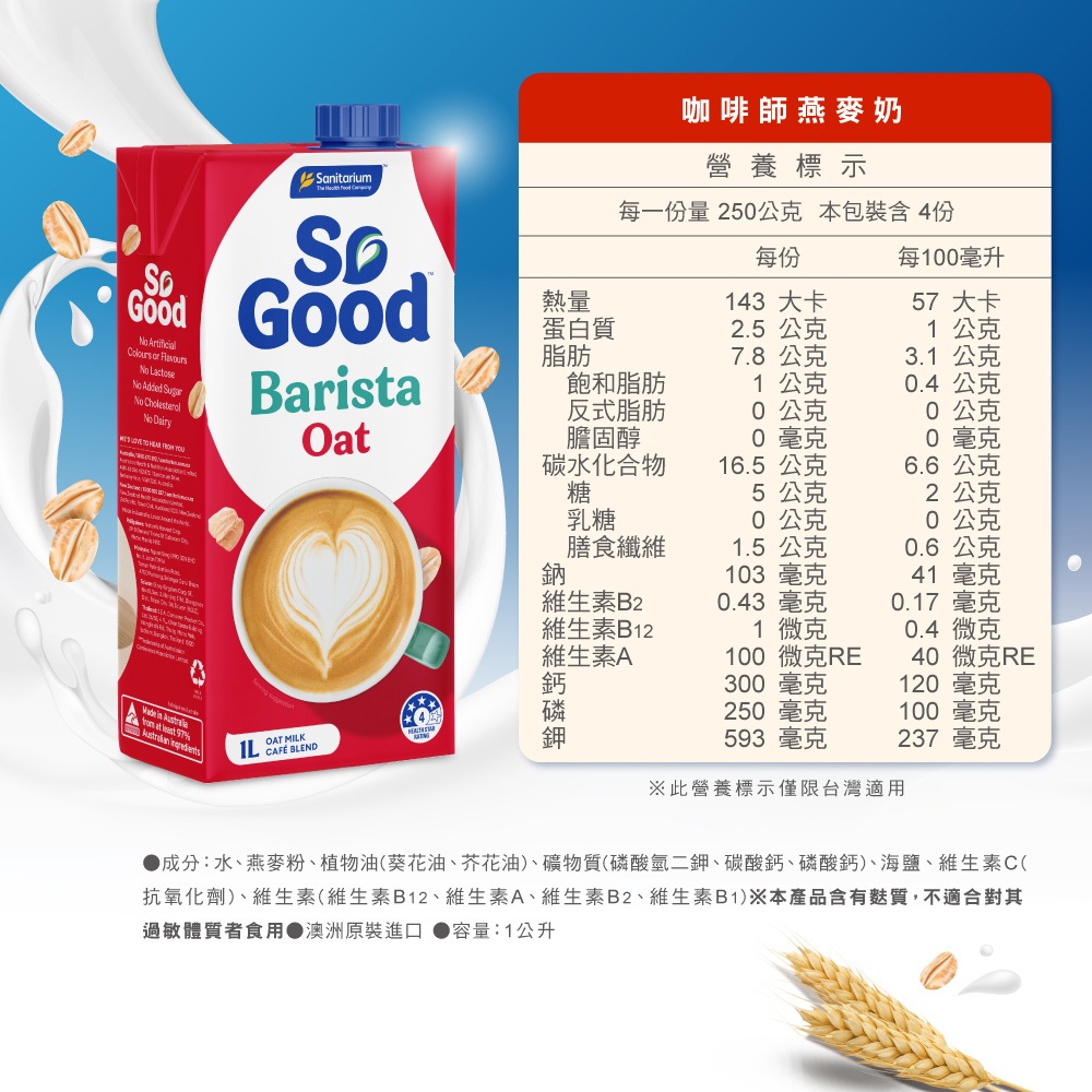 【Sanitarium So Good】澳洲原裝進口植物奶|Barista咖啡師燕麥奶1L|官方直營Barista 燕麥奶1L|超取限6罐Non-dairy MilkACE Family健康家庭官方旗艦店