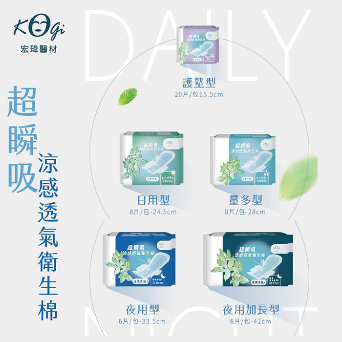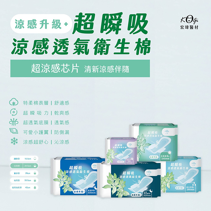 買一送一*宏瑋 超瞬吸 涼感 透氣衛生棉 護墊/日用型/量多型/夜用型/夜用加長型 有效日期:2026年5月涼感【護墊】15.5cm-20片,買一送一|涼感【日用型】24.5cm-8片,買一送一|涼感【量多型】28cm-8片,買一送一|涼感【夜用型】33.5cm-6片,買一送一|涼感【夜用加長型】42cm-6片,買一送一Feminine Care923就愛傘 官方直營店