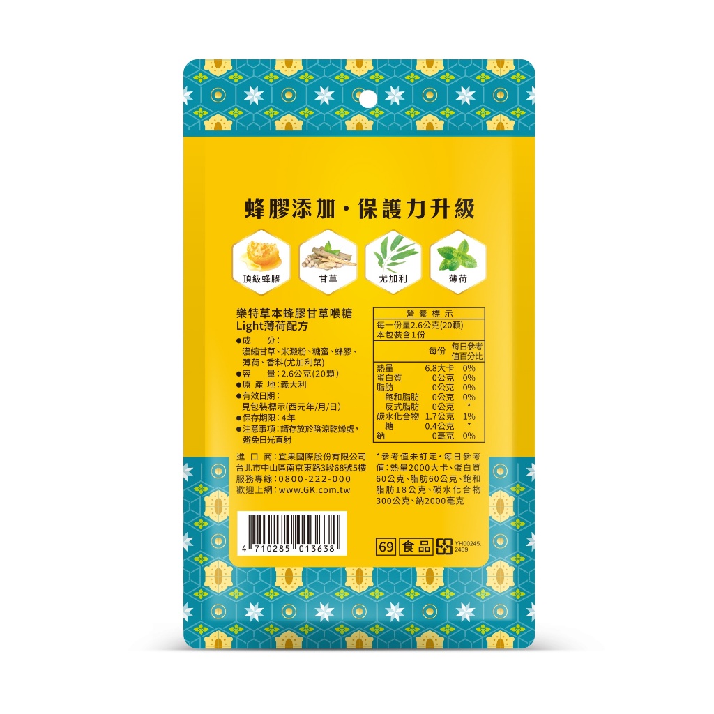 【維維樂】樂特草本蜂膠甘草喉糖|Light薄荷配方|20顆/袋|官方直營樂特草本蜂膠甘草喉糖|Light薄荷配方Well BeingACE Family健康家庭官方旗艦店