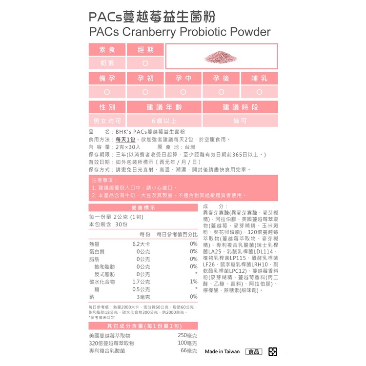 BHK’s PACs蔓越莓益生菌粉 (2g/包;30包/盒) 官方旗艦店1盒|3盒|6盒Well BeingBHK’s 官方旗艦店
