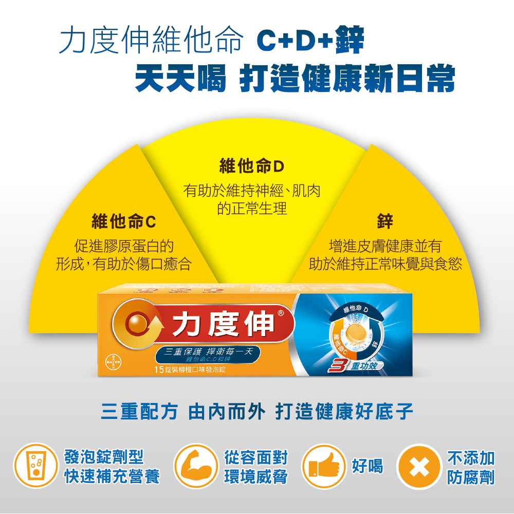 力度伸 維他命C+D+鋅 發泡錠 30錠(柳橙口味) | 台灣拜耳官方旗艦店發泡錠 30錠Well BeingBayer台灣拜耳品牌旗艦館