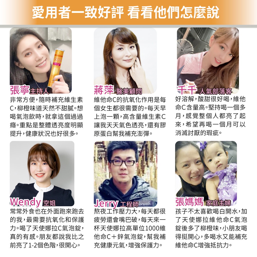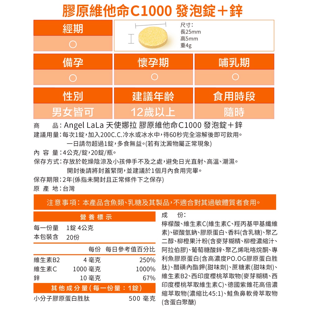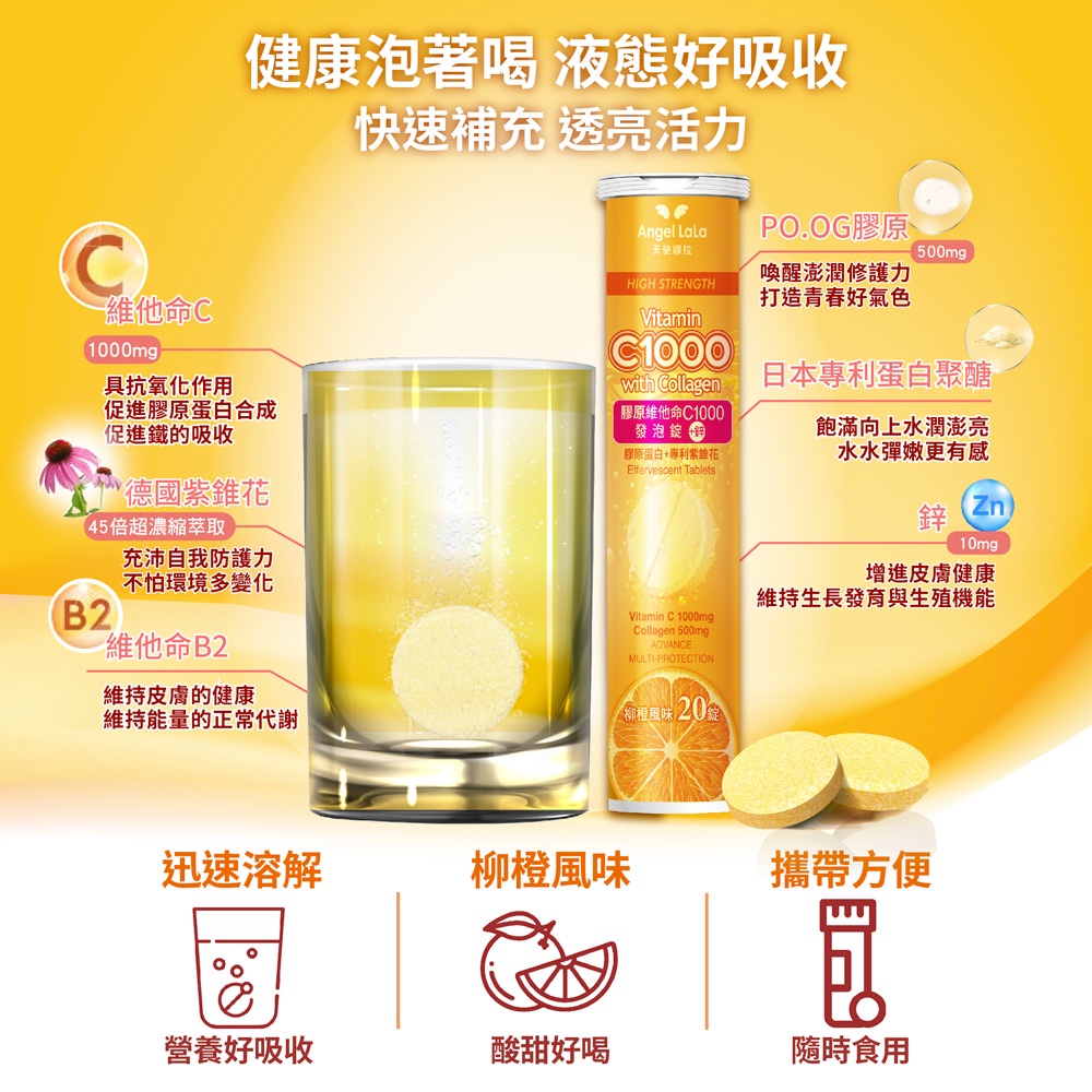 Angel LaLa天使娜拉_膠原維他命C1000發泡錠+鋅(20錠/瓶/柳橙風味)1瓶|3瓶|5瓶Beauty Supplements【官方旗艦店】Angel LaLa 天使娜拉 你的美麗生活