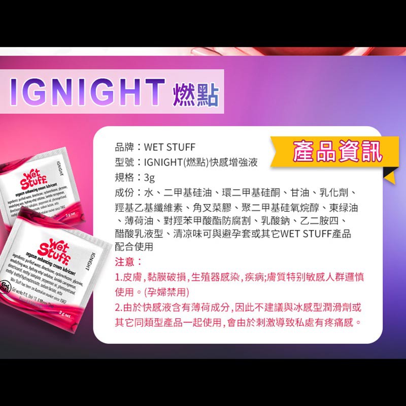 【今天訂 明天到】澳洲 Wet Stuff IGNIGHT 陰蒂刺激 狂潮快感 女用激情乳液隨身包-3g 提升敏感 嗨潮